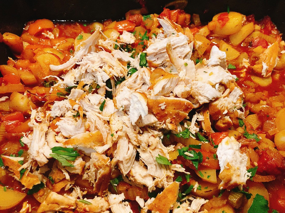 Eigentlich soll das Gericht ja nicht später am Esstisch im Wohnzimmer gegessen sondern auf einer Hütte aus einer Thermoskanne serviert werden. Das funktioniert natürlich mit ganzen Hähnchen, Hähnchenkeulen oder Hähnchenbrust nicht, deswegen der naheliegende Tipp von Markus Sämmer, das Fleisch in kleine Stücke zu schneiden. Schneiden ist aber gar nicht notwendig, am Ende der Garzeit (laut Rezept 35 Minuten, ich hatte es 45 Minuten im Ofen) ist das Fleisch so zart, dass man es wie Pulled Pork mit der Gabel zerpflücken kann.