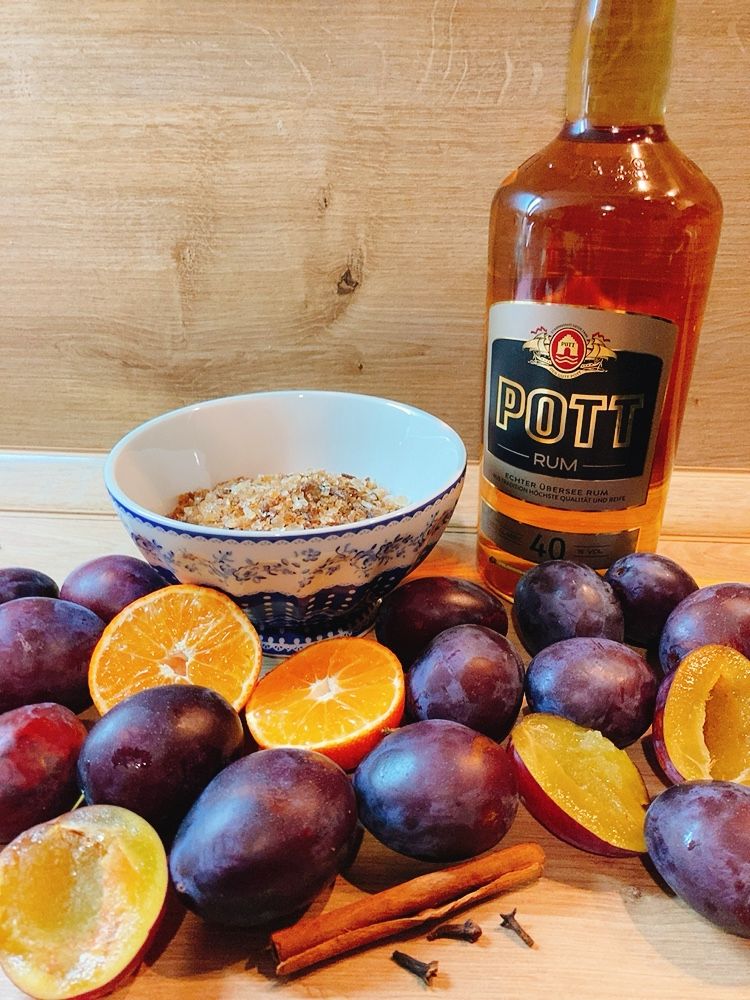 Man nehme sich also ein paar reife Zwetschgen, jeder nach seinen Möglichkeiten von der eigenen Streuobstwiese, aus dem eigenen Garten oder gekauft beim Bauern, auf dem Wochenmarkt oder im Supermarkt. Benötigt werden weiterhin Kandiszucker, Orangen, Zimt und Nelken sowie – natürlich – Alkohol, in unserem Fall Rum.