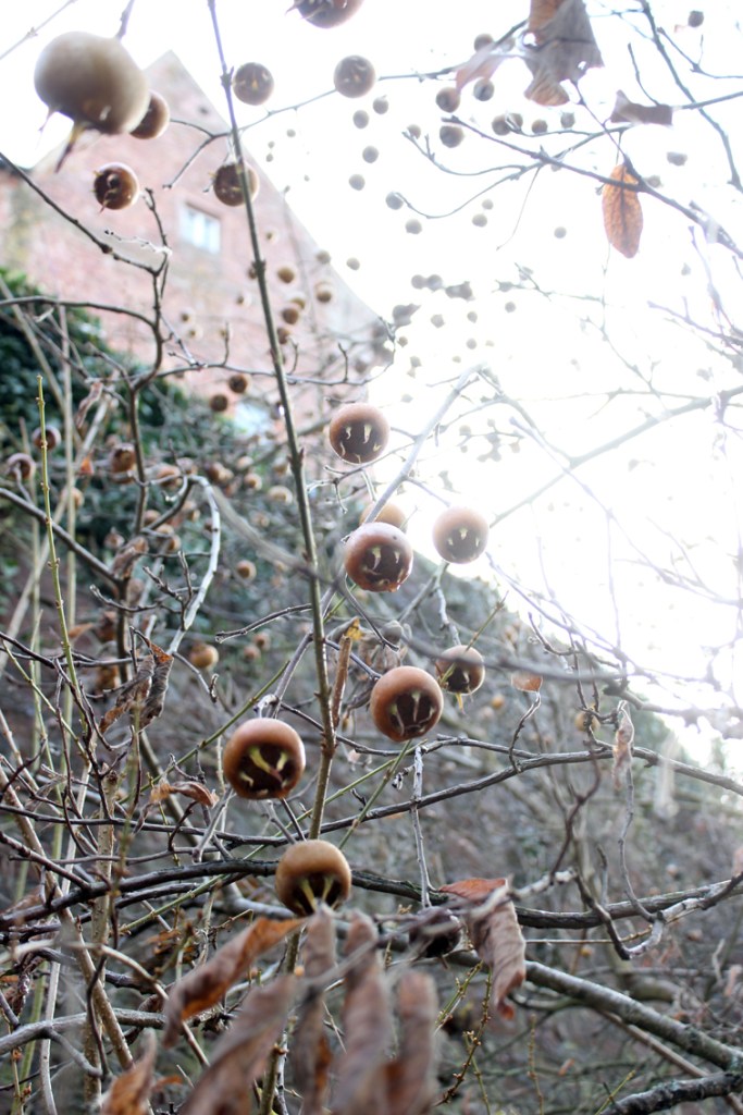 Im barocken Burgpark der Gamburg ob der Tauber (siehe: https://burg-gamburg.de/) wächst ein alter Mispelbaum.