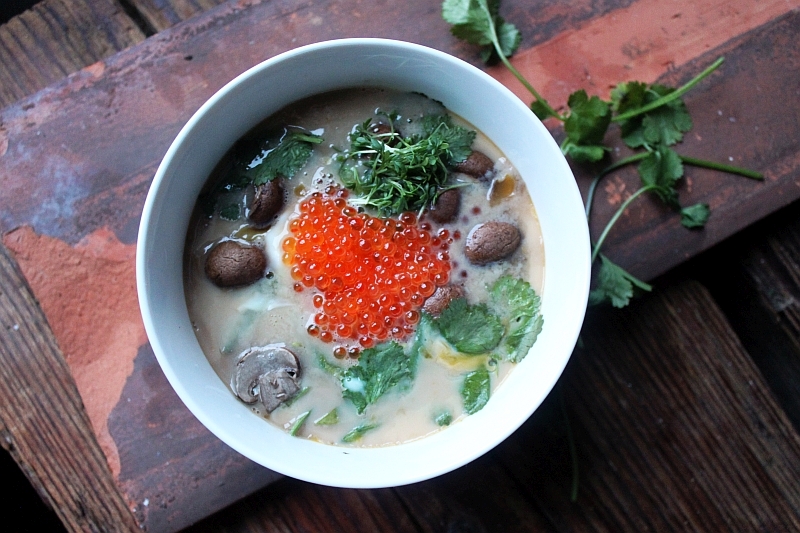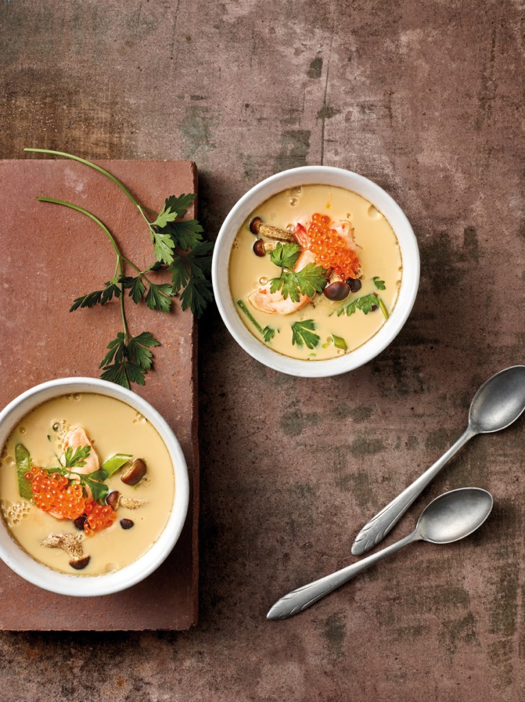 Chawan Mushi -gestocktes Ei mit einer Brühe von Meeresalgen, Bonito und süßem Reiswein, Pilzen und Forellenkaviar