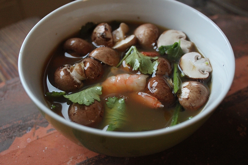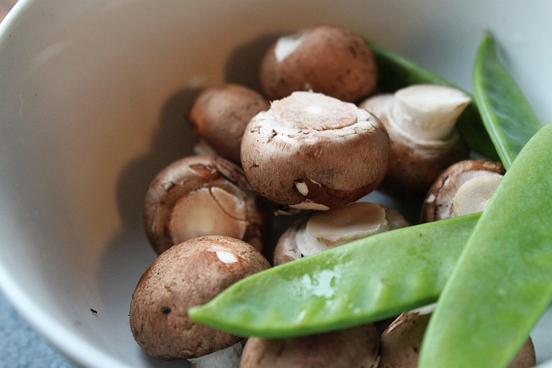 In zwei Porzellanschälchen schichtete ich nun wechselweise für eine bunte Mischung die Pilze, die Zuckerschoten-Julienne und Garnelen. Auch die zarten Stängel vom Koriander gab ich mit hinein und zwar tatsächlich rupfte ich die Blättchen nicht ab, sondern beließ sie am Stängel.