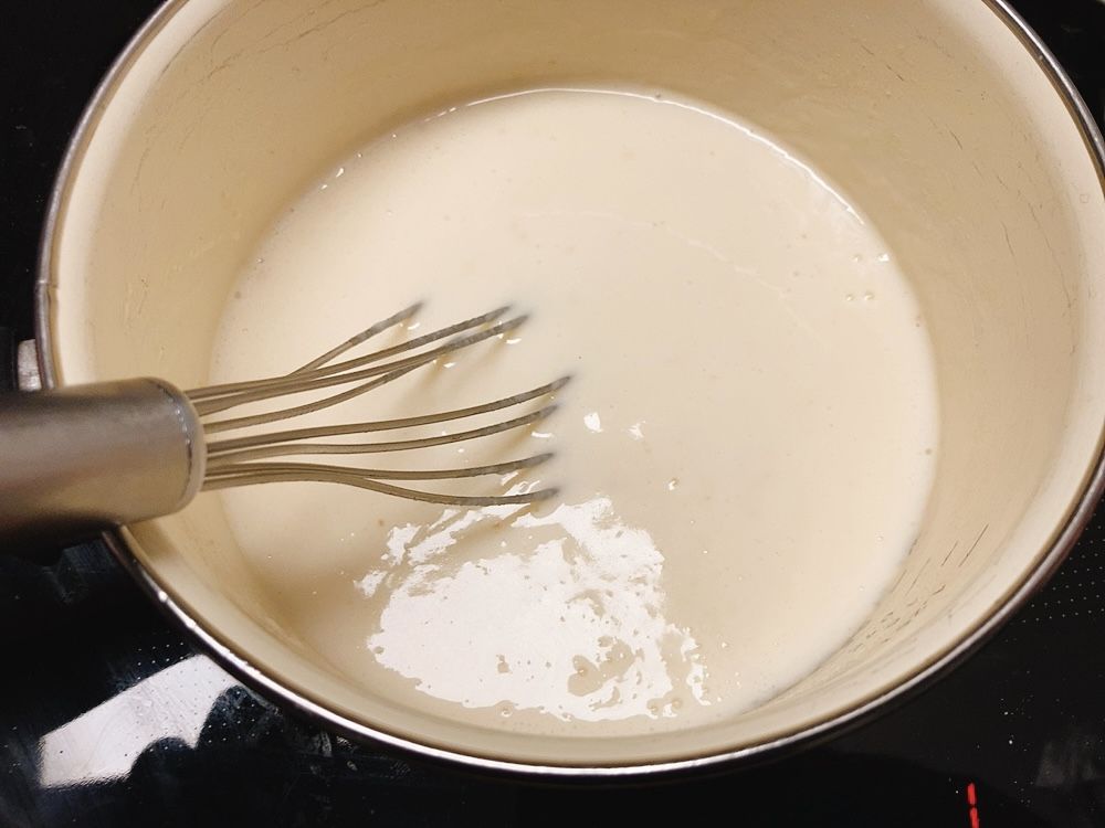 Zunächst wird aus Butter, Mehl und Milch sowie Salz, Pfeffer und Muskatnuss eine Béchamel Sauce hergestellt.