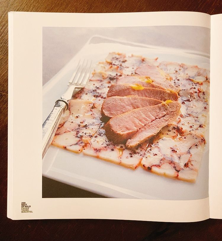 Natürlich enthält das Buch auch Rezepte für die Klassiker der Wildküche, z.B. geschmorte Wildschweinkeule, aber hier zeigt Karl Josef Fuchs sehr schön, was sich aus der Keule noch alles zaubern lässt – wenn man sie denn vorher zu Schinken zubereitet. Im Original liest sich das Ganze dann so: