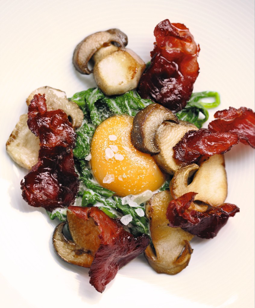 Wenn die Pilze aus der Pfanne sind, direkt den in Scheiben geschnittenen Schinken nachlegen und braten. Den Spinat auf die Teller geben und in die Mitte eine kleine Vertiefung drücken; in diese setzt man ein frisches Eigelb. Pilze und Schinken ringsum verteilen, Meersalz drüber streuen und – tadaaa – fertig ist eine extrem leckere Vorspeise. Der leicht salzige Schinken passt hervorragend zu dem Spinat in der Béchamel Sauce, das cremige Eigelb passt hervorragend zu dem Schinken und den Pilzen. Mit wirklich einfachen, bodenständigen Zutaten ohne viel Chichi hat Karl Josef Fuchs hier ein tolles Gericht gezaubert.