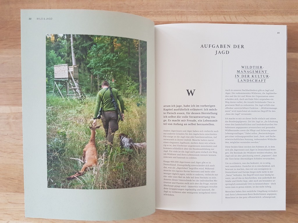 Nun zum Buch: Im Vorwort erklärt Autor, warum er jagt, aber er widmet sich auch den „Aufgaben der Jagd“ und dem „Wild als Lebensmittel.