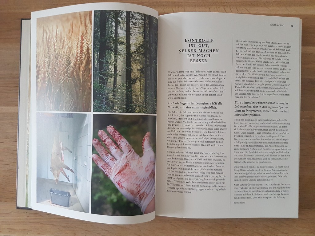 Fazit: Ein gelungenes Wildkochbuch, das auch mit ansprechenden Bildern, Lust auf Wild macht. Spannend auch die Verarbeitung von Zutaten, die man am „Wegesrand“ findet, wie Mädesüßblüten, wilder Hopfen, Schlehen oder Holunderkapern. Ich weiß zwar nicht wo der „Bursche“ kochen gelernt hat, aber meinen Respekt hat er inzwischen!