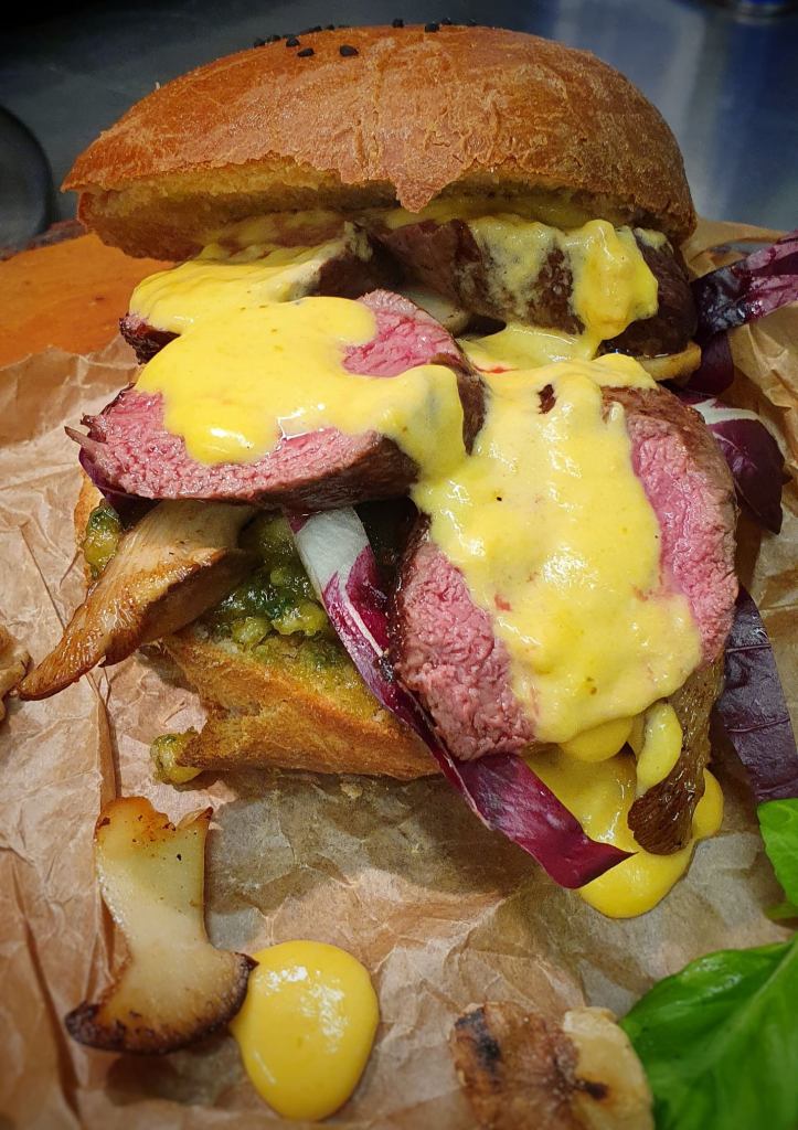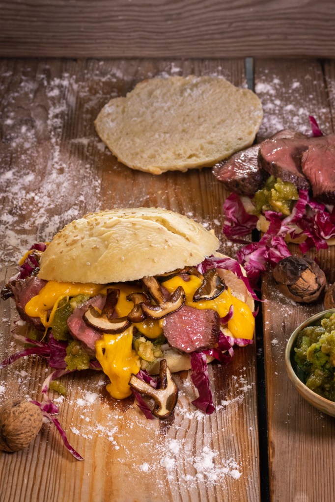 5. Die Pilze währenddessen in Scheiben schneiden und bei geringer Hitze in Butter braten, bis sie beginnen, Farbe zu nehmen. Beiseite stellen und in der noch heißen Pfanne den Cheddar schmelzen und die Crème fraîche unter dem Käse rühren. Zuletzt das Fleisch dünn aufschneiden und mit Radicchio, Pesto, zerlassenem Käse und den gebratenen Pilzen auf die Brötchen geben.