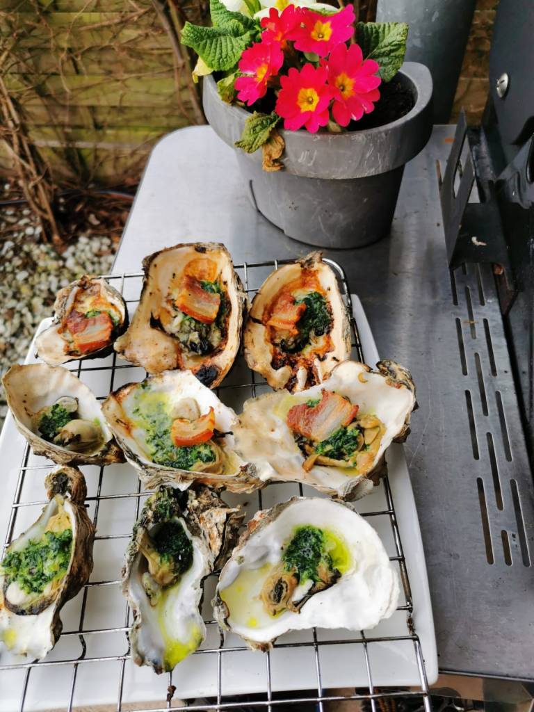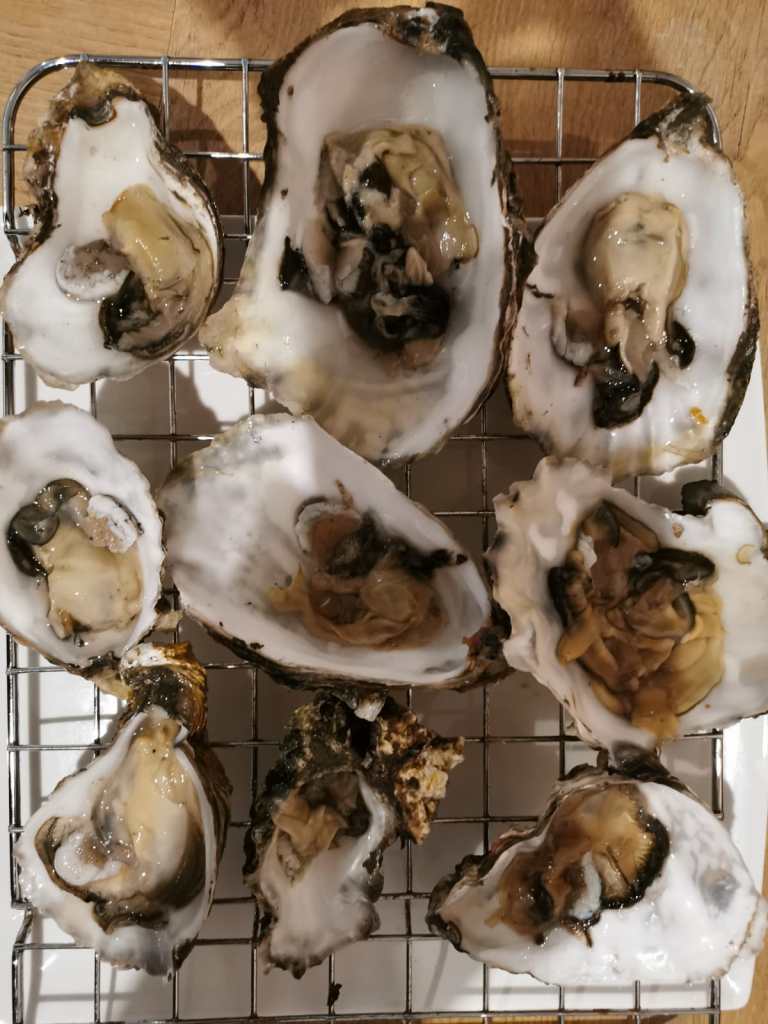 „Austern a la francaise“, überbackene Austern mit Bärlauchbutter und ein wenig Schinken.