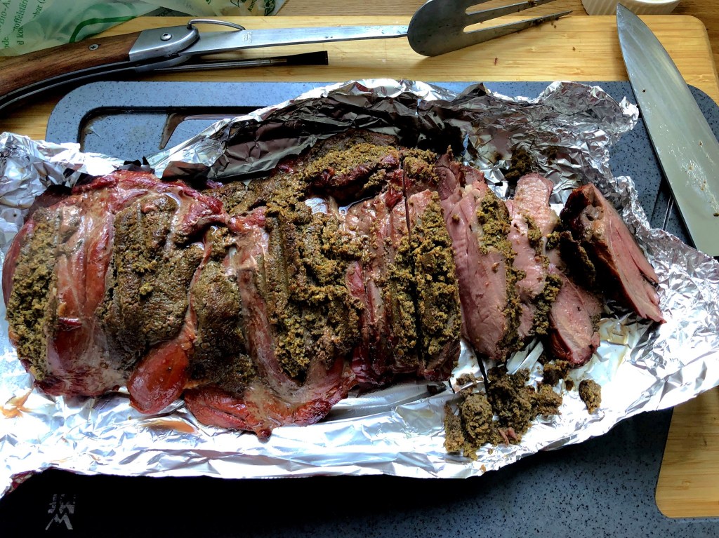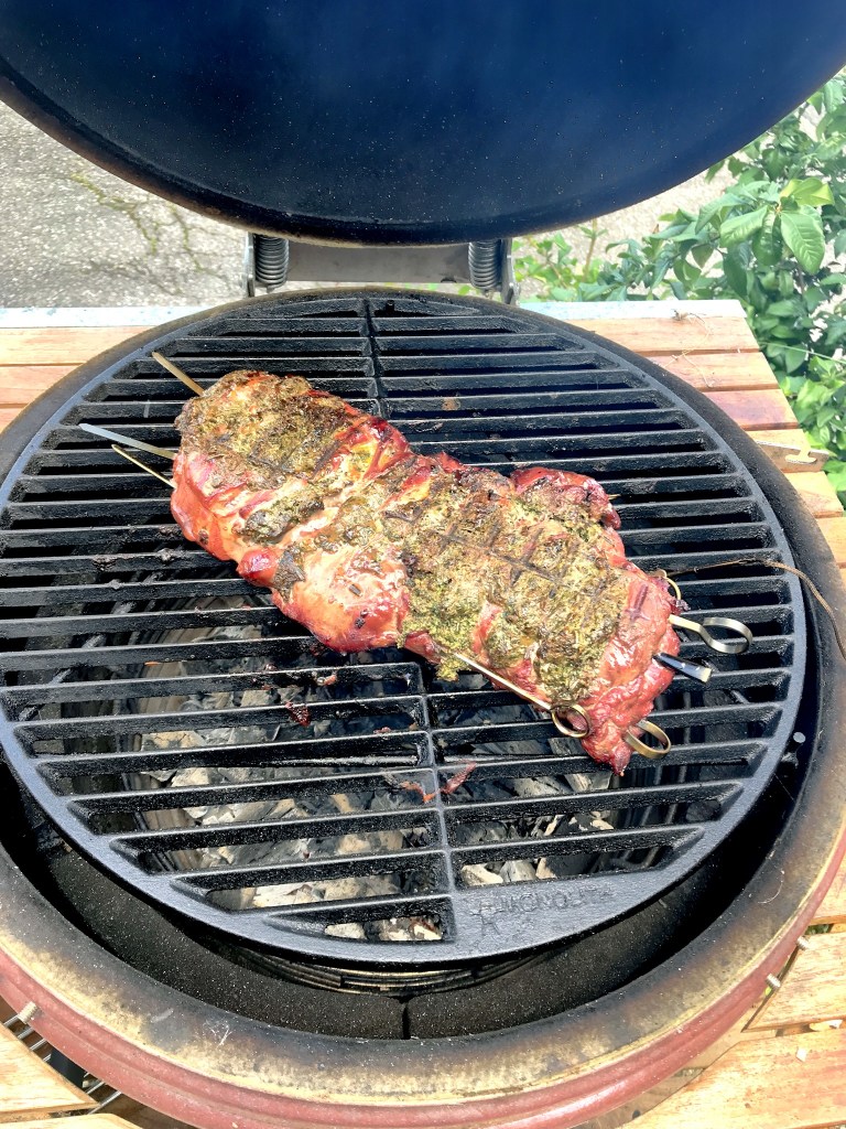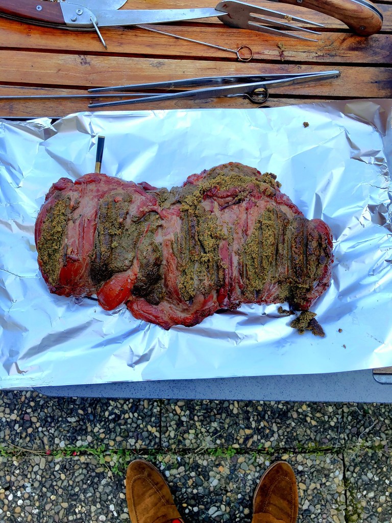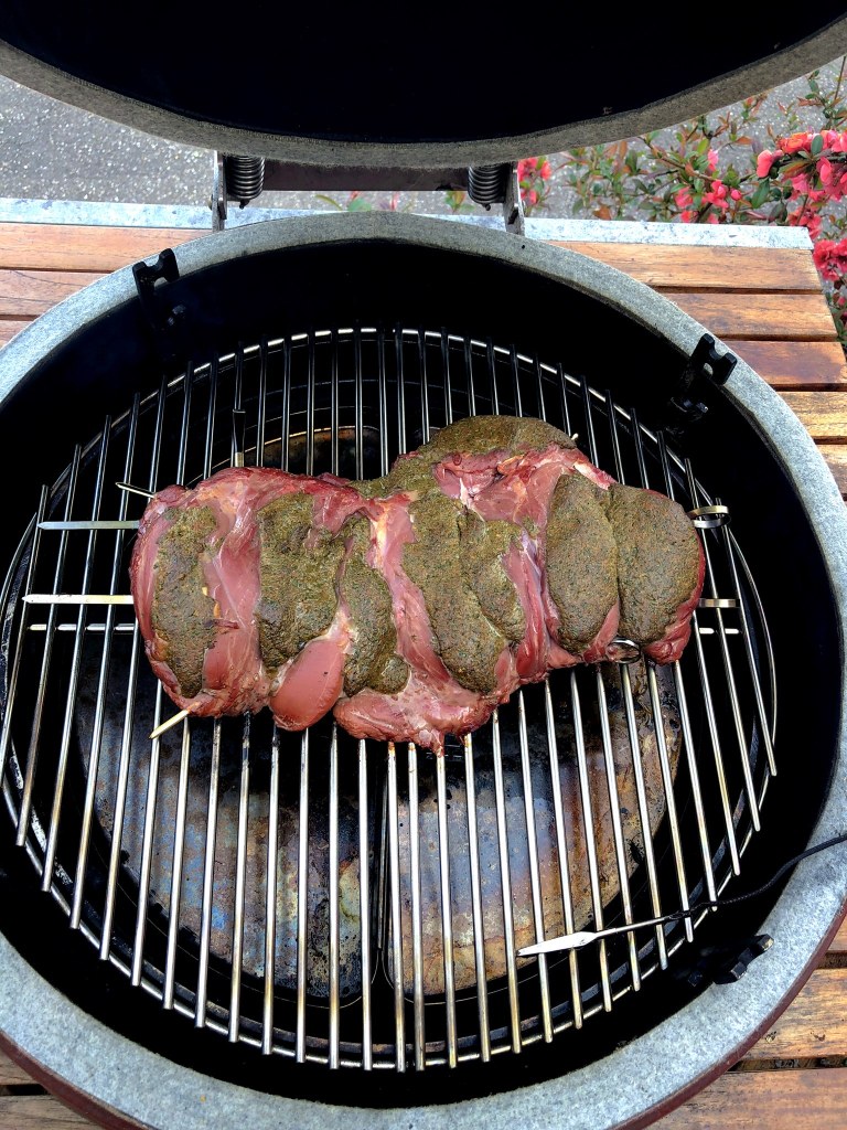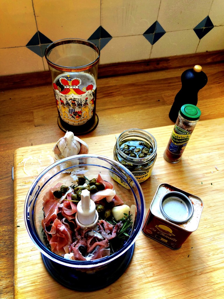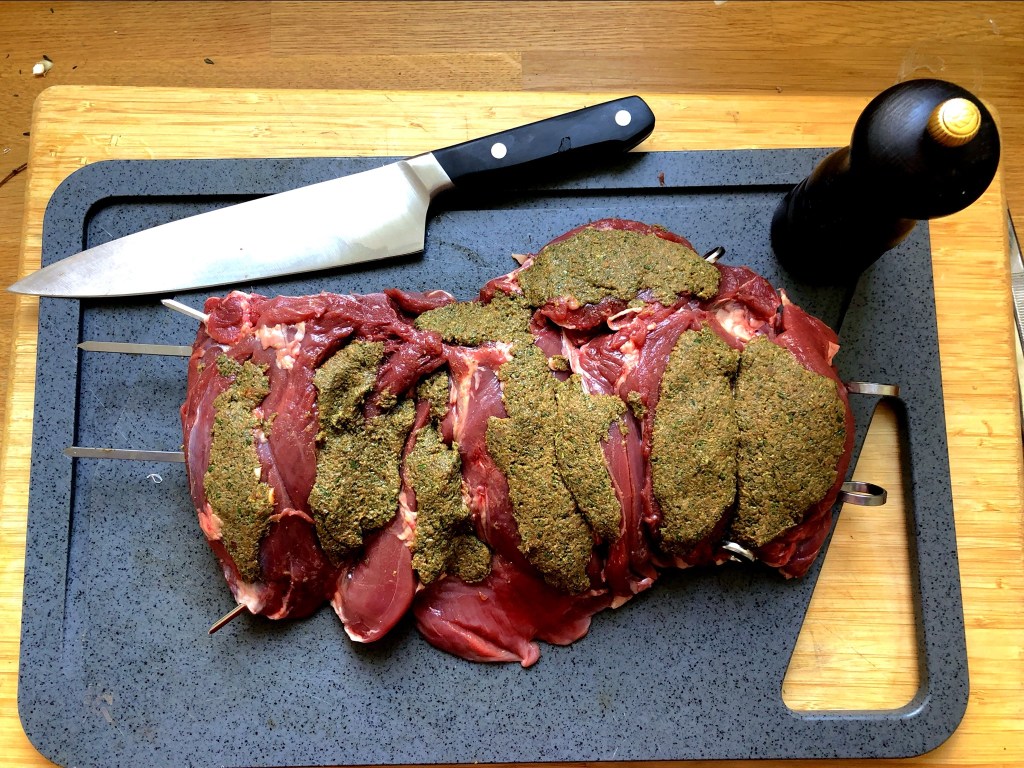 Alle übrigen Zutaten im Mixer zu einer möglichst feinen Paste verarbeiten und die dann fest in die Taschen eindrücken. Keule nicht weiter salzen – Sardellenfilets und Schinken liefern ausreichend Salz. Keule mit zwei diagonal eingestochenen langen Metallspießen stabilisieren, damit man sie wenden kann. Wenn notwendig, weitere Spieße nehmen.