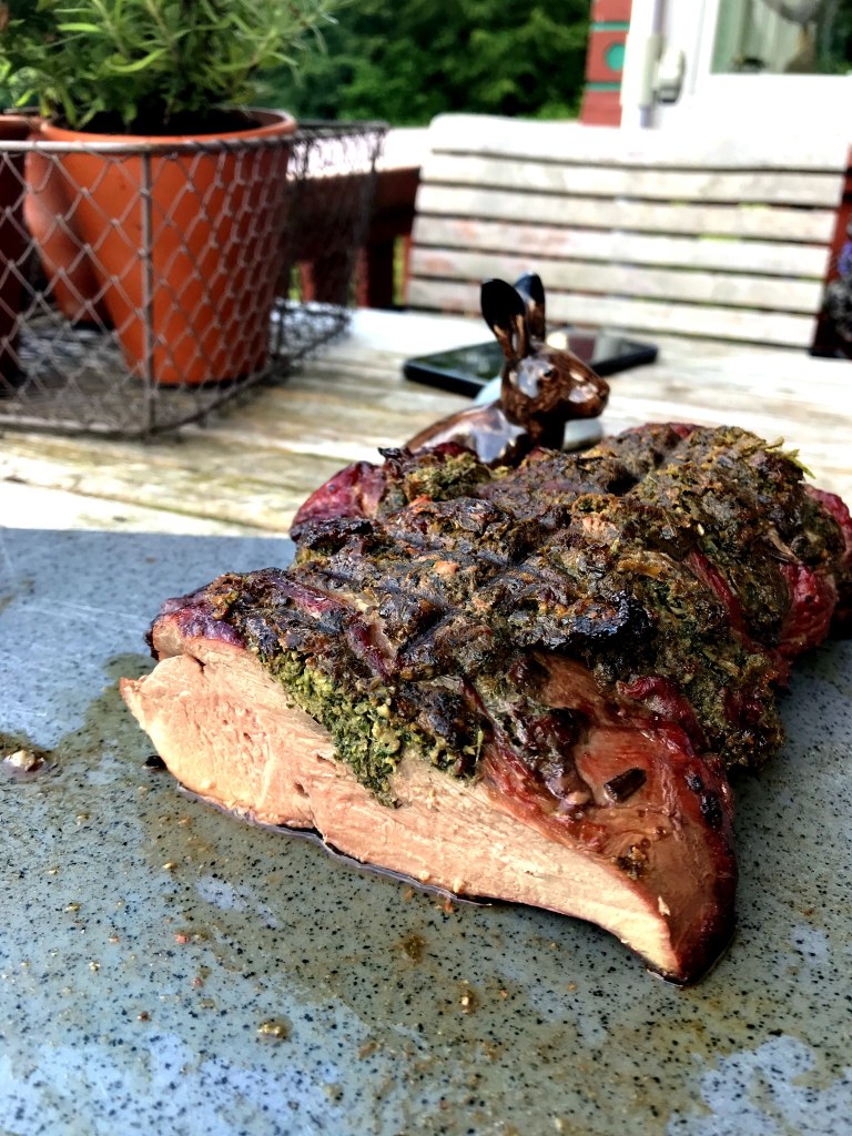 Pro Seite (die ohne Taschen zuerst) 12-15 min grillen, am besten bei geschlossenem Grill. Kerntemperatur: 65 Grad. Pro Seite ein Rauchstoß, den gern kräftig, je nach Geschmack.