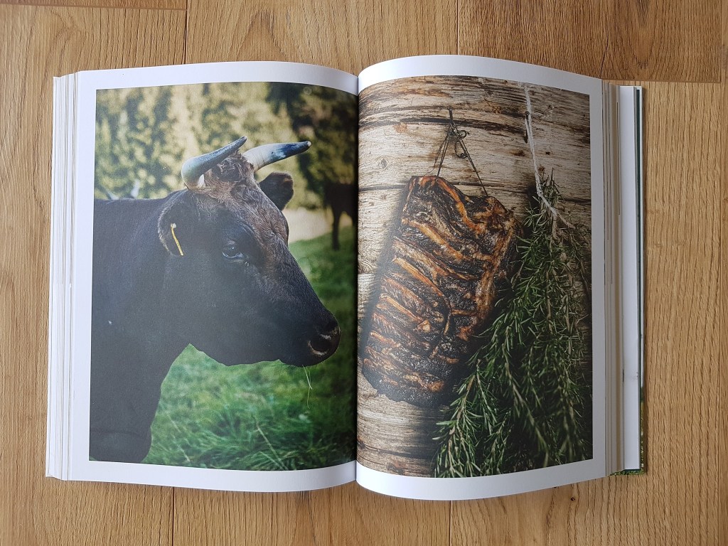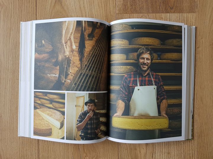 Im Innern setzt sich der Stil fort. Markus lächelt den Betrachter mit einem Käse in den Händen an, mit einem Hund im Arm, mit Imkerschleier, und beim Hochwerfen eines Kürbis. Dass der Mann Spass beim Umgang mit Kulinarischem hat, kommt dabei ganz gut rüber. Aber nicht nur der Autor ist zu sehen, nein, das ganze Buch ist prall gefüllt mit gut arrangierten Bildern, in warmen Tönen und kräftigen Kontrasten. Beim Durchblättern hat man das Gefühl, etwas Hochwertiges in Händen zu halten, und man bekommt Lust in einen Apfel zu beißen oder ein gutes Stück Käse zu essen.