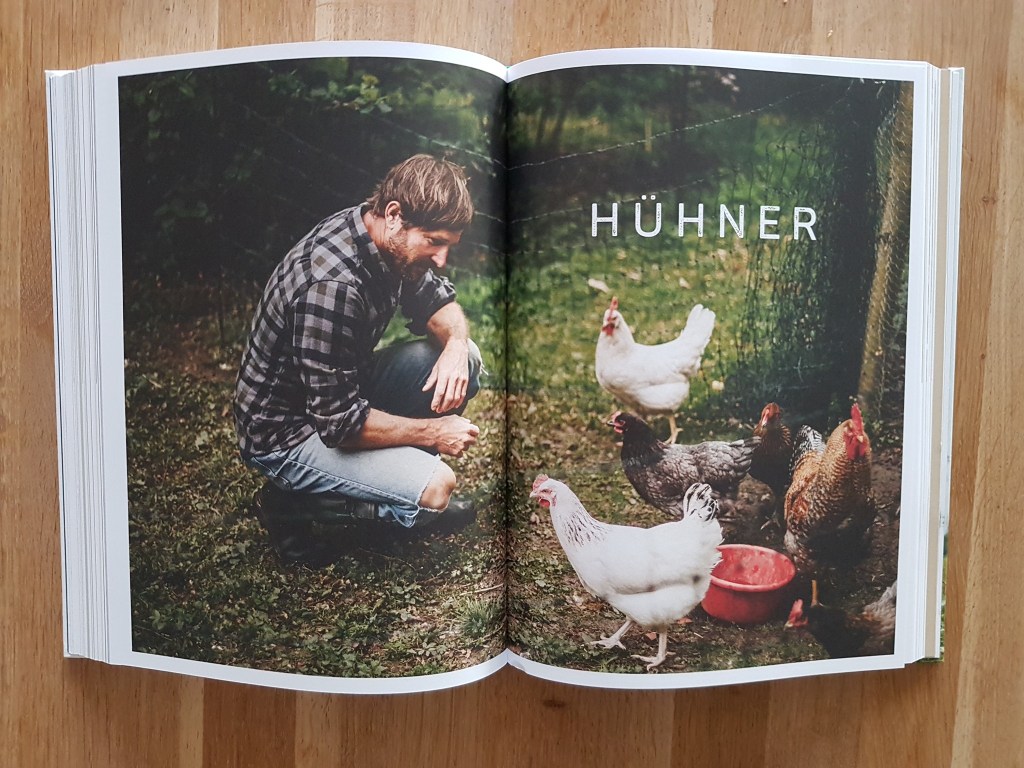 Hühner – Hier geht es um das Glück des Hühnerhaltens und der Leser erfährt grundsätzliches zur Hühnerhaltung. Gefülltes Brathähnchen mit Gewürzreis, Deviled Eggs (eingefärbte und gefüllte Eier) und Herzhafte Bratäpfel mit Geflügelinnereien seien als Rezeptbeispiele genannt. Auch am Ende des Kapitels wird noch einmal auf die Haltung von Hühnern, sowie die Kennzeichnung von gekauften Eiern eingegangen.