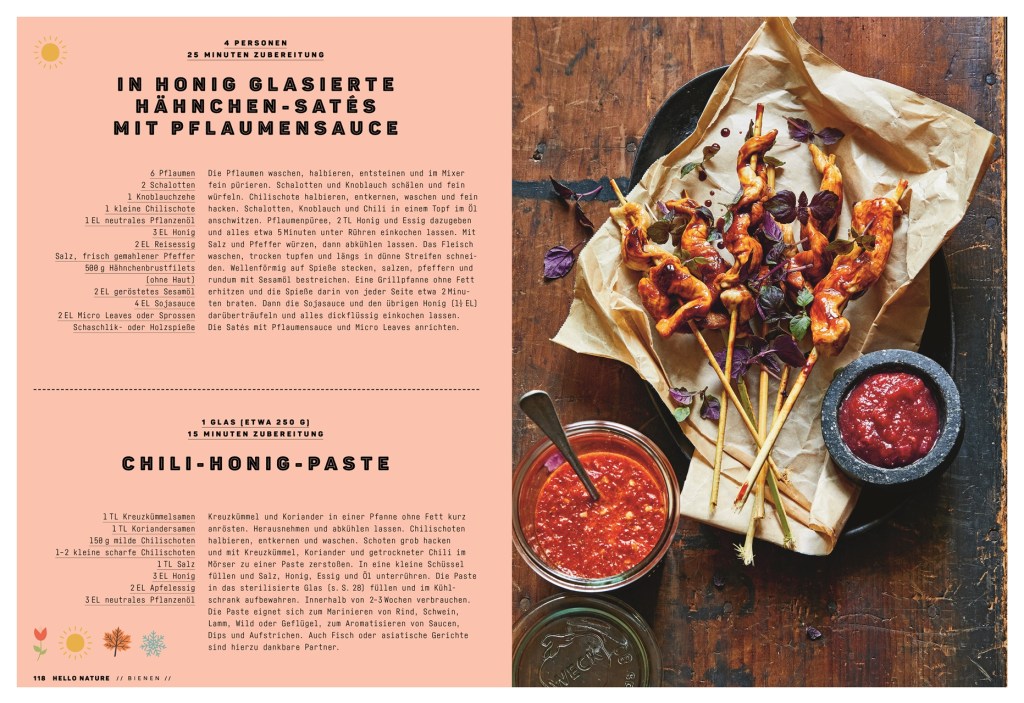 Bienen – Essentielles zur Bienenhaltung wird erwähnt. Aber auch, dass man ohne fundiertes Wissen beim Imkern mehr Nutzen als Schaden verursachen kann. Dieser Hinweis freut mich als Imker ganz besonders, denn die Bienenhaltung ist ein sehr komplexes Thema, was hier ganz richtig angesprochen wird. Bei den Rezepten findet man z.B. Lebkuchen, Salziges Honig-Mandel-Eis oder Chili-Honig-Paste. Danach eine Seite die zum Thema Honig informiert.
