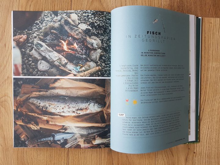 Ausprobiert habe ich bisher die Scharfe Wildsalsicchia, die Apfel-Honig-Schnecken und den Fisch in Zeitungspapier gegrillt.