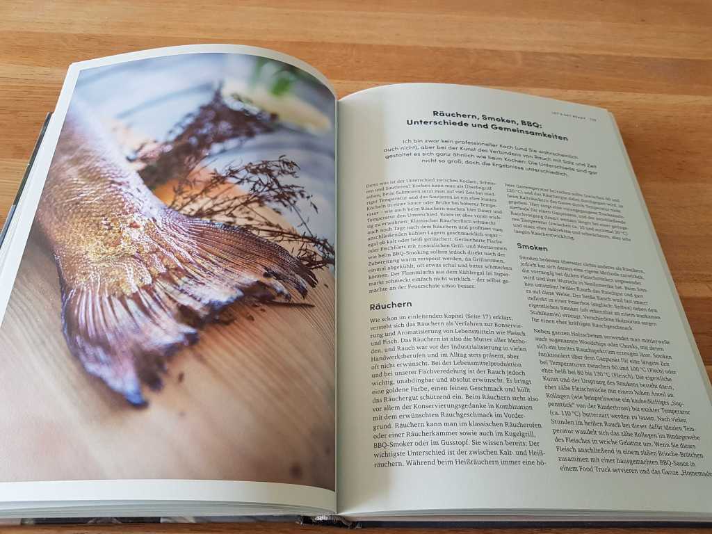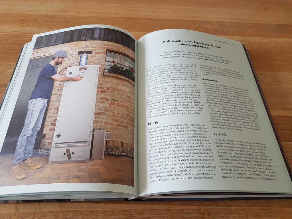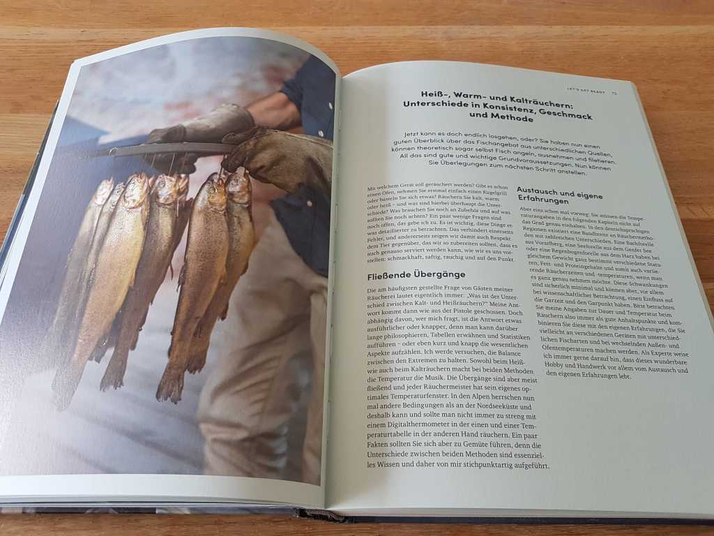 Ein Fischräucherbuch also. Noch eines, dachte ich so bei mir. Weit gefehlt! Es ist so viel mehr. Ein Fischräucherbuch, ein Buch für Angler, ein anspruchsvolles Kochbuch, und darüber hinaus lässt er auch populärwissenschaftliche Erkenntnisse über die Chemie des Räucherns und der Lebensmittelverarbeitung einfließen. Und, es ist ein wunderschönes Bilderbuch mit perfekten Drucken und Fotographien. Hilfe hatte er dabei von Daniela Haug, Miriam Strohbach und Flora Hohmann. Allesamt Fachfrauen auf den Gebieten der Fotographie, des Informationsdesigns und der Kochkunst.