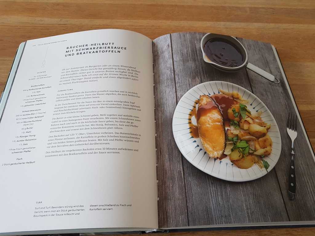 Ein Rezept auf der Seite 216 hat mich dann sofort inspiriert: Räucher-Heilbutt mit Schwarzbiersauce und Bratkartoffeln.