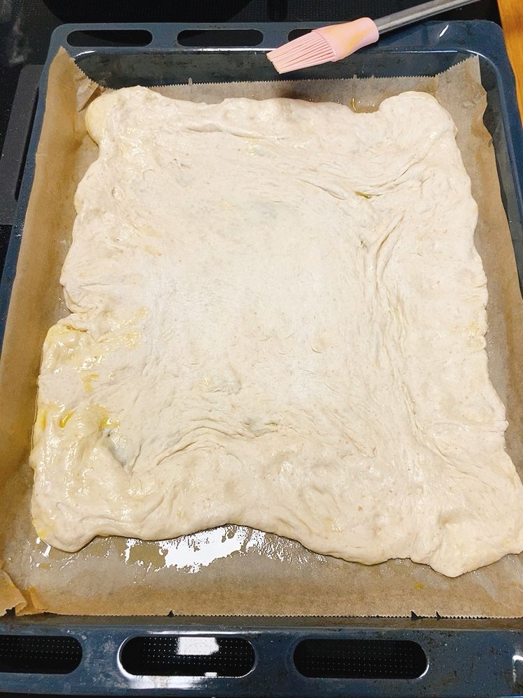 Anschließend ein Blech mit Backpapier belegen und dieses mit Olivenöl bestreichen. Den Teig auf die Größe des Backblechs ausziehen, darauflegen und nochmals 1-2 Stunden reifen lassen.