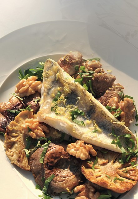 Die Hautseite der Fische noch etwas salzen und pfeffern, auf den Pilzen anrichten und mit fein geschnittenem, zartem Grün und Gelb von Stangensellerie bestreuen.