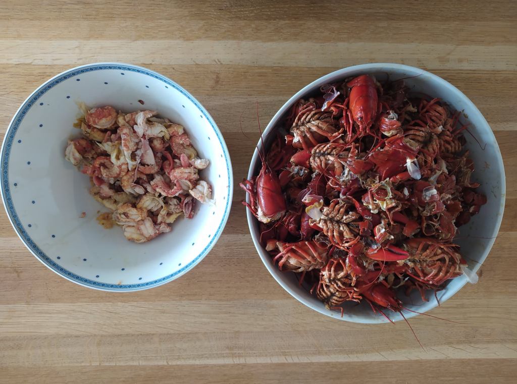 Für das unten eingefügte Rezept mit 475 g Krebsfleisch werden zumindest 37 Krebse benötigt. Die meisten Tiere sind jedoch kleiner. So kommt man leicht auf 50 Krebse für das Essen. Diese nicht nur nach einander zu kochen, sondern vor allem alle zu knacken, ist eine Arbeit, deren Zeitaufwand nicht blauäugig unterschätzt werden sollte. Die Zangen knacken sich übrigens leichter mit einer Rohrzange…