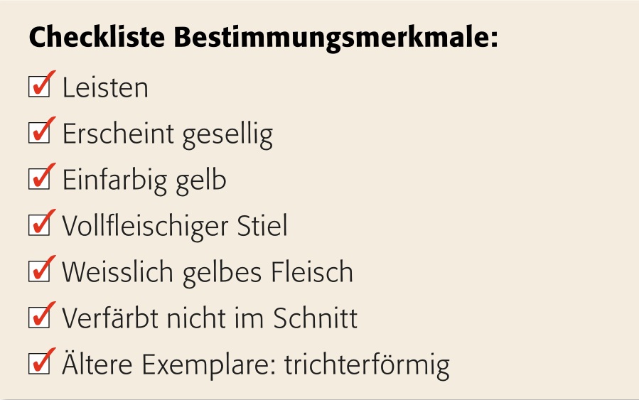 Eierschwamm oder Pfifferling Der Eierschwamm ist der bekannteste aller Leistenpilze. Manchmal trifft man im Wald auf ein einzelnes Goldnugget, einen einsamen Eierschwamm – den sollte man unbedingt stehen lassen. Das gilt auch für Exemplare, die unter 3 cm hoch sind. Gejagt werden nur reife Nashörner. In der Regel tritt der Eierschwamm gesellig und in den verschiedensten leuchtenden Gelbtönen auf. Junge Exemplare haben einen eher flachen Hut, und je reifer der Pilz wird, desto trichterförmiger erscheint sein Hut.