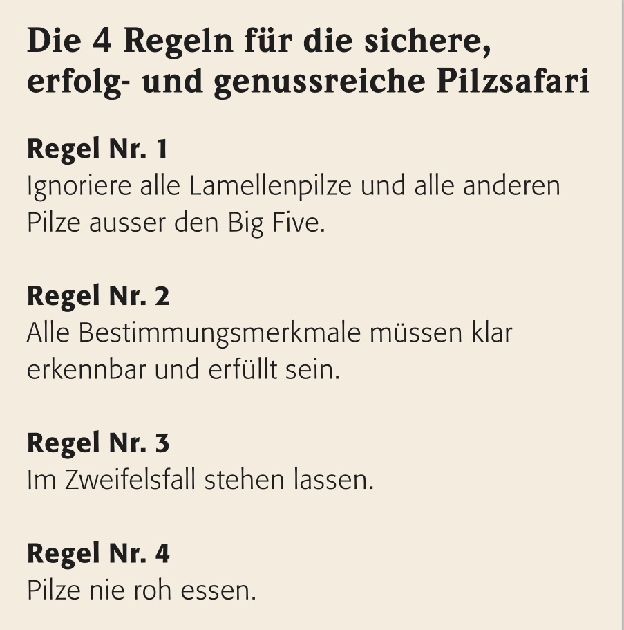 Wer also Lamellenpilze ignoriert, ist bereits im grünen Bereich. Die goldene Überlebensregel bezüglich Pilzen lautet somit einfach: Lass alle Lamellenpilze links liegen. Selbstverständlich gibt es auch giftige Röhrenpilze, nur wirkt keiner von diesen tödlich. Nebst den Lamellen- und Röhrenpilzen gibt es noch Leisten- und Stachelpilze sowie andere Formen und unverwechselbare „Einzelkämpfer“.