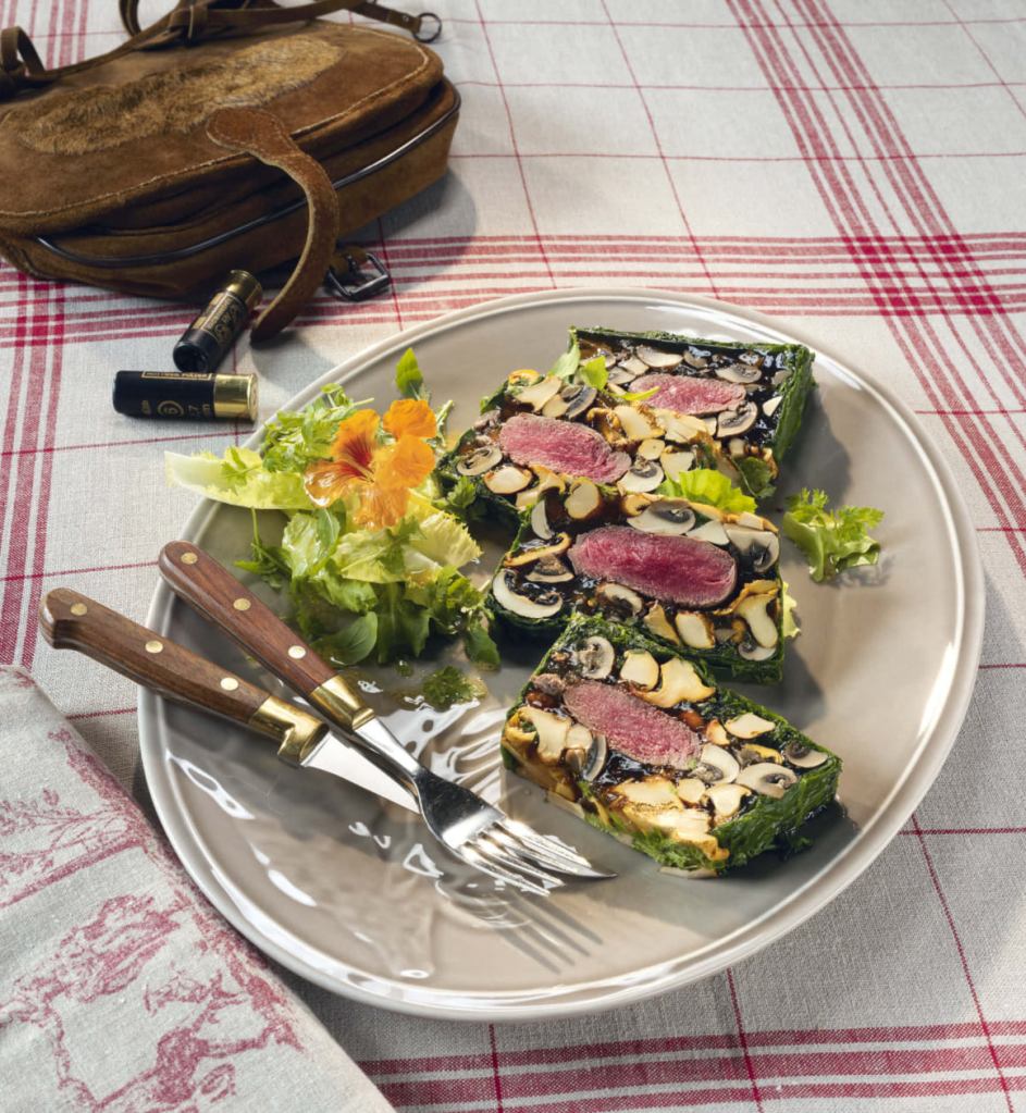 400 ml Pilzfond abmessen, je einen EL Kerbel und Petersilie gehackt und die Pilze zugeben und vermengen. Die Form etwa 3 cm hoch mit dem Pilz-Kräutergemisch befüllen, im Kühlschrank kurz anziehen lassen, dann die Rehfilets mittig platzieren und die restliche Pilzmischung darauf füllen. Die Form 2–3-mal kräftig auf dem Tisch aufstoßen, damit etwaige Luftbläschen entweichen können. Nun die Oberfläche mit den restlichen Spinatblättern belegen. Terrine für 5 Stunden, am besten über Nacht, fest werden lassen. Vor dem Anrichten die Terrine kurz in heißes Wasser stellen und aus der Form auf ein Brett oder ähnlichem stürzen.
