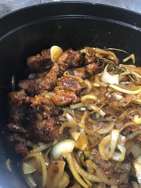 Es ist wirklich interessant wenn man sich genau an ein Rezept halten muss, aber ich habe doch es nicht über das Herz gebracht ein Gulasch ohne Paprika zu kochen …..Als Wildbret verwendete ich die Schulter eines erlegten Rothirsches, genauer gesagt nur die Stücke aus der Elle. Das Wildrezept von Martin Kintrup verlangt ein Lorbeerblatt. Wir hatten im Spielweg, warum auch immer, kein einziges mehr, dafür einen Thymianzweig. Die 150 g Fleisch pro Person empfinde ich als Badener nicht besonders reichlich bemessen…