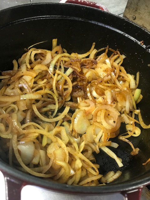 Die Zwiebeln und Steinpilzstiele dazugeben und mitbraten, bis sie ebenfalls gebräunt sind.