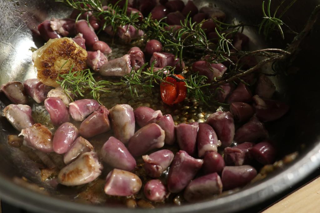 Denn Kutschmatschi ist keinesfalls ein lieblos zu Brei verkochter Eintopf, sondern ein intelligentes, modernes, nachhaltiges nose-to-tail-Gericht: Geflügelinnereien – hier Herzen, Mägen und Lebern vom Huhn – werden kurz und kräftig angebraten und dann mit Zwiebeln und Knoblauch aromatisiert, mit Nüssen (Hasel- oder Walnüsse, Mandeln oder Pinienkerne) ergänzt und in Granatapfelkernen und -saft schmorend zu etwas ganz Besonderem geadelt. Die Herzen sind ein Muss, die Mägen und Lebern sind optional und am besten in angepassten Zeitfenstern zuzufügen; auch Innereien von anderem Geflügel oder vom Kaninchen sind willkommen. Sicher sind frische Kräuter als Akzentuierung passend, Schärfe aus frischen oder getrockneten Chilis gehört bei uns immer dazu, aber auch guter Pfeffer wie die BASS-Pfeffermischung aus Kampot (https://www.hennesfinest.com/shop/kampot-pfeffer/206/bass.-pfeffermischung-aus-kampot.-100g ) von Hennes Finest sorgt für Pfiff.