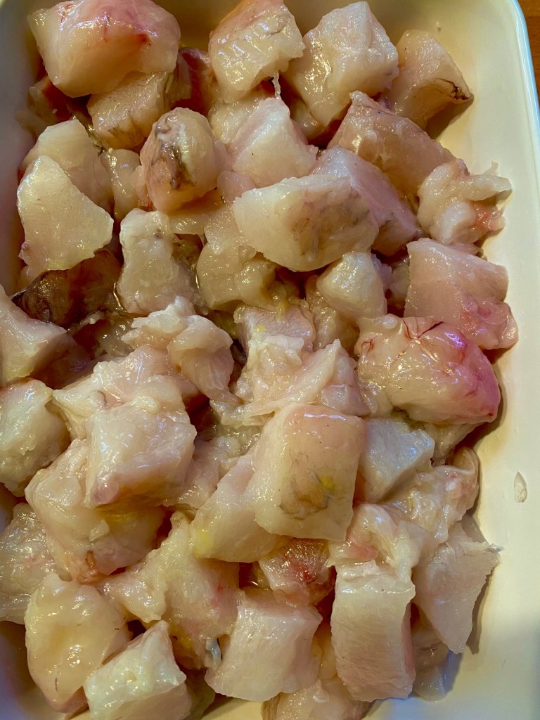 Fischfilets in mundgerechte Stücke schneiden, eventuell noch vorhandene Gräten entfernen, mit Zitrone beträufeln und auf Seite stellen.