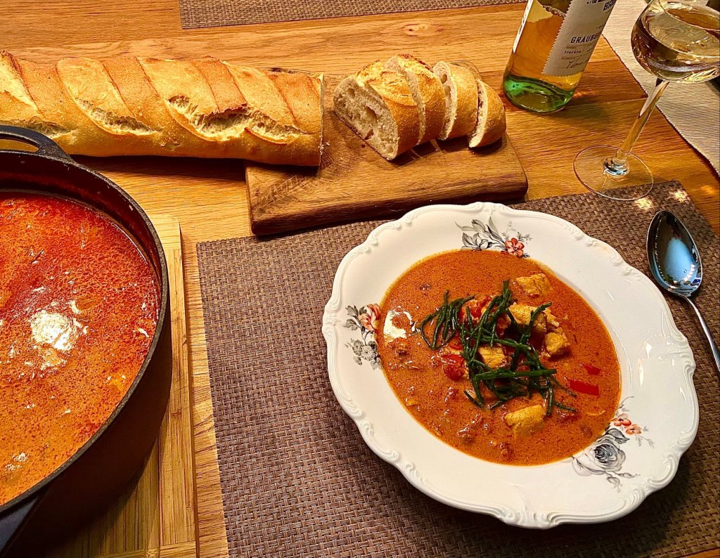 Am Ende die leicht gesalzenen Fischstücke mit in den Topf geben und ca. 5 Minuten garziehen lassen – schnell und heiß auf den Tisch bringen und am besten mit frischem Baguette oder Kaviarbrot servieren.