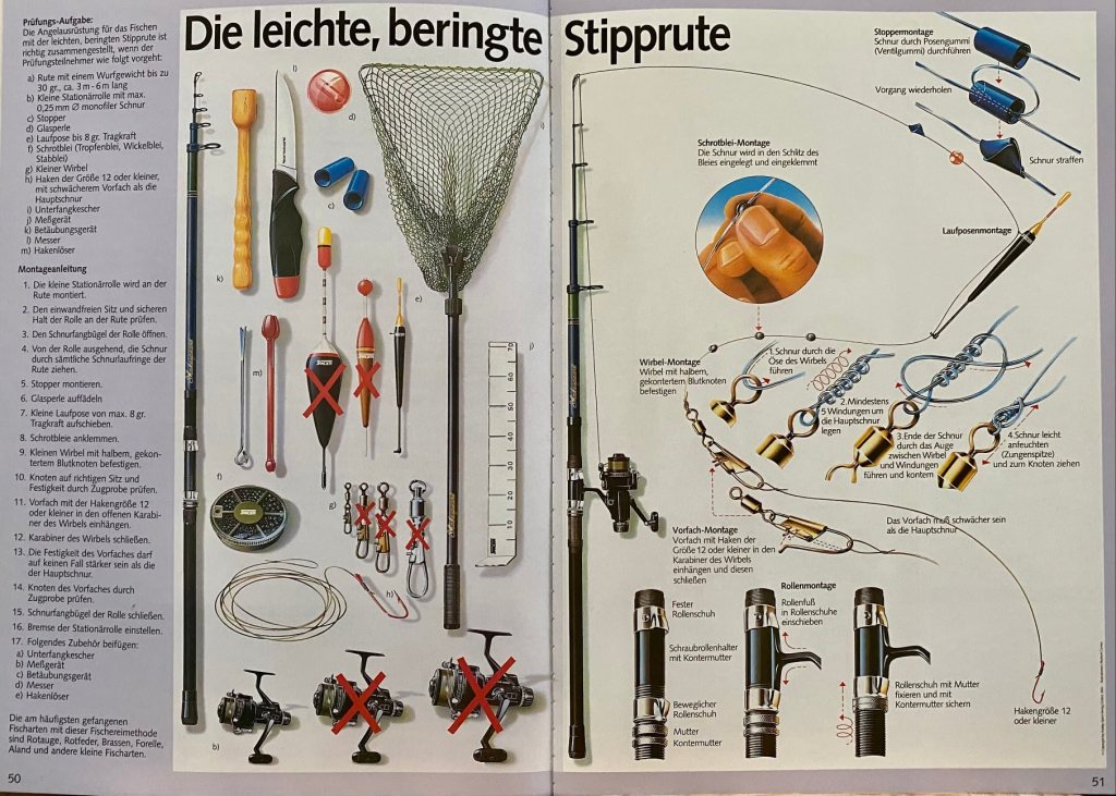 Der Tag kam, zunächst eine schriftliche Prüfung – dies war kein Problem und als zweites sollte eine Angelrute waidgerecht zusammengebaut werden. Der Prüfer kam auf mich zu, er wirkte auf mich wegen eines Augenleidens sowie seines Auftretens wie ein Pirat und ließ mich aus einer Auswahl verdeckter Karten eine ziehen. Es wurde die leichte beringte Stipprute.