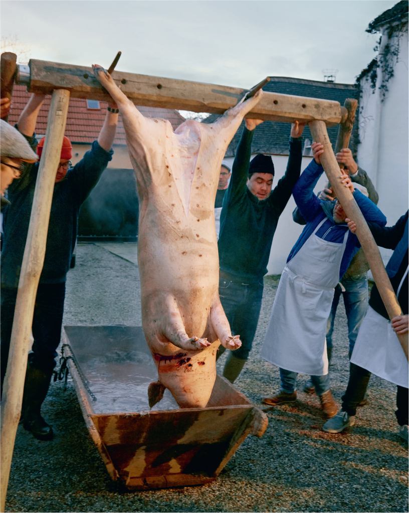 »Bis vor gar nicht allzu langer Zeit war nicht nur Gemüse, sondern auch Fleisch saisonal. Das Schwein war für uns Menschen eine Art lebende Vorratskammer: Im Sommer, wenn es war war und es Nahrung in Hülle und Fülle gab, wurde es fett gemästet mit Abfällen und all den Überschüssen, die keiner essen mochte. Wenn es dann kalt wurde und nichts mehr auf den Feldern wuchs, wurde es geschlachtet, zerlegt, verwurstet und eingesalzen – eine zweite, fleischliche Ernte. Alles, was sich nicht gut lagern lässt – die Innereien, das But, Fleischabschnitte -, wurde von den Helfern am Schlachttag frisch gegessen oder verarbeitet Und weil das ein Freudetag war mit Wein, Musik und Tanz, hieß und heißt das im Burgenland „Sautanz“.