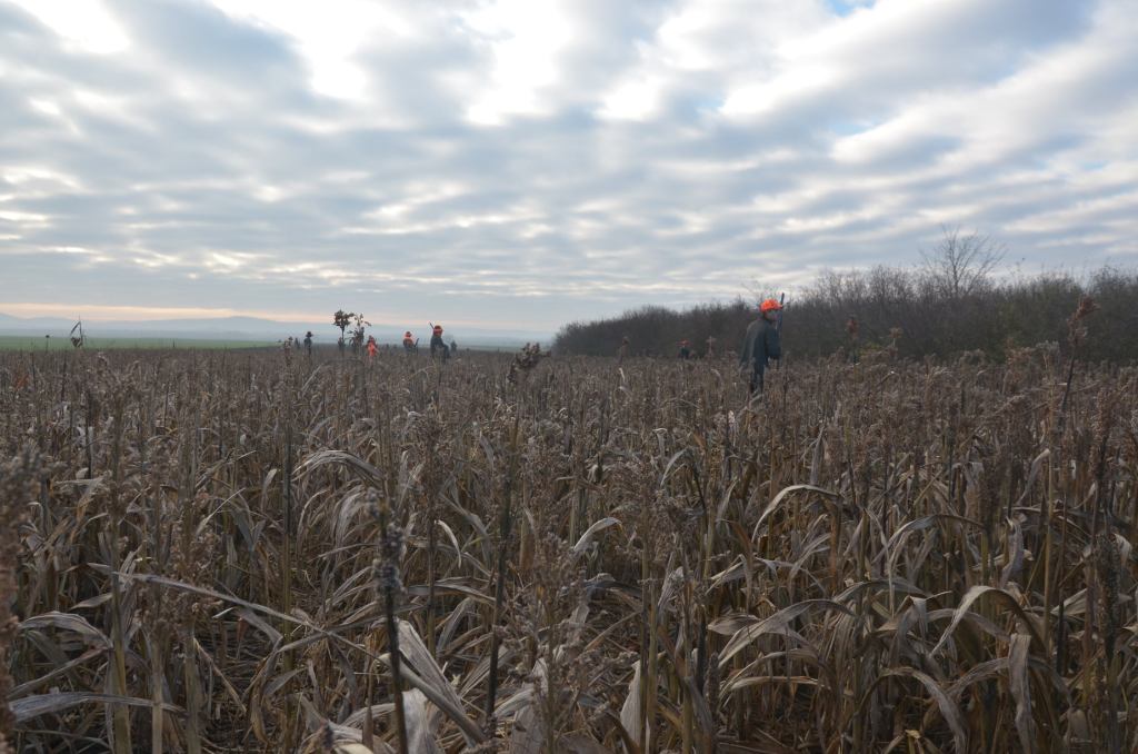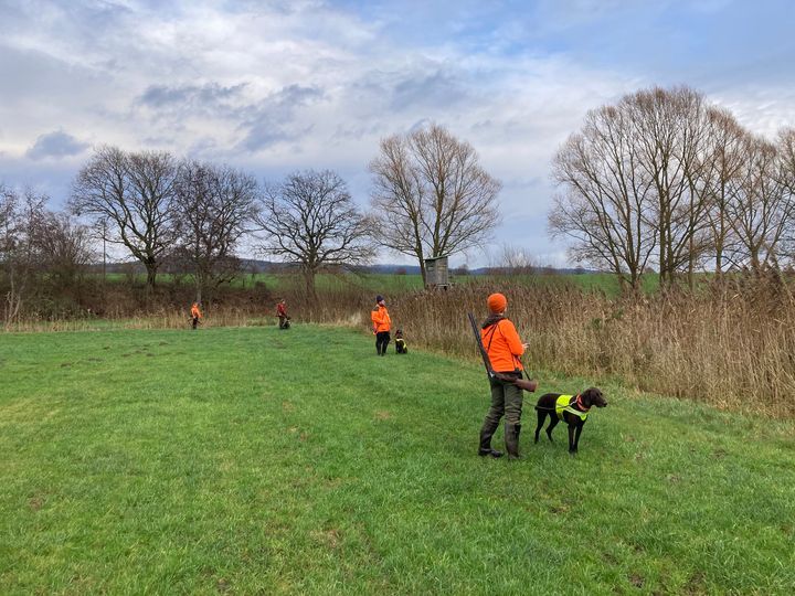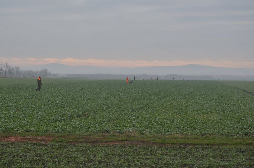 Vom Horizont bewegt sich eine Kette orangefarbener Gestalten über Winterweizen langsam auf das Feldgebüsch und die Vorstehschützen zu. 800 Meter sind das mindestens.