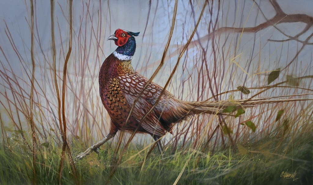 Zwei Rehe flüchten. Scharfe Kommandos der Hundeführer rufen die zur Verfolgung ansetzenden Hunde zurück. Dann das unverwechselbare Geräusch eines startenden Fasans. „Henne!“, schallt es laut von mindesten zwei Jägern gleichzeitig und die hochgerissenen Flinten sinken in die Habachtstellung zurück. Plötzlich ruft es weiter links: „Hahn!“.