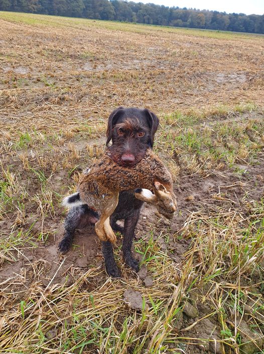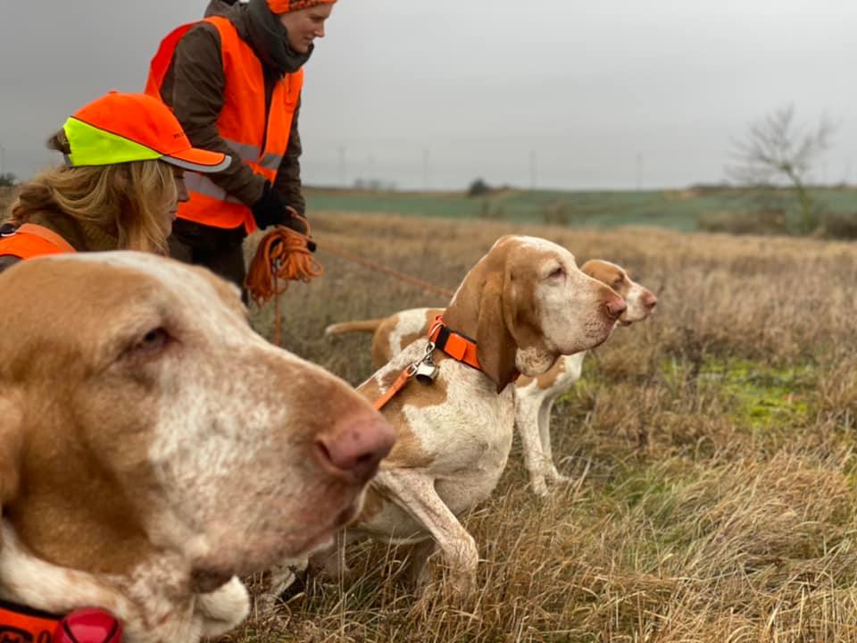 Die Hunde sind an der Leine wegen der viel befahrenen Straße am Feldrand. Dann etwas, mit dem auf einer Treibjagd niemand rechnet: Aus dem schmalen Feldgebüsch in der Ferne flüchten sieben Gestalten, eine große und sechs kleinere. Für Hasen zu groß, Rehe bewegen sich anders. Es dauert ein wenig, bis wir Vorstehschützen erkennen können, dass da eine Bache mit sechs Frischlingen auf unsere Kette zu flüchtet. Wir blicken auf freies Feld mit dem Rücken am Waldrand. Jetzt wird es spannend. Doch die Bache prescht ziemlich genau zwischen meinem Nachbarn und mir durch die Reihe und stoppt auch nicht, als sie hinter uns krachend und knackend ins Gebüsch bricht. Die schon kräftigen Frischlinge sind vor der Schützenreihe stehen geblieben und laufen auf dem Feld unschlüssig im Kreis, bis einer sich traut durch die Schützenkette der Bache zu folgen und die anderen ihm hinterher flüchten. Die Schweine sind verschwunden. Gelächter, Kopfschütteln und verwunderte Kommentare in der Vorstehschützenreihe. Doch nun beanspruchen die ersten Hasen die Aufmerksamkeit. Einige flüchten auf die Reihe zu. Einer verharrt, weiß nicht, wohin er will, wagt sich zu nah heran und rolliert, als er das Feld über die Flanke verlassen will. Sehr viele Hasen verlassen die Felder über die Flanken an diesem Tag.