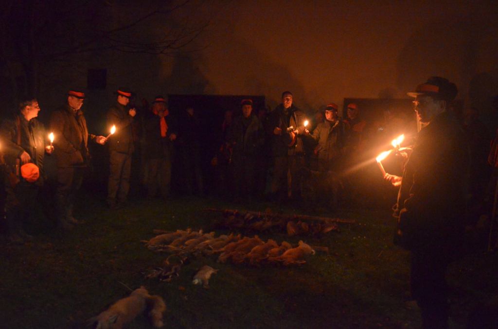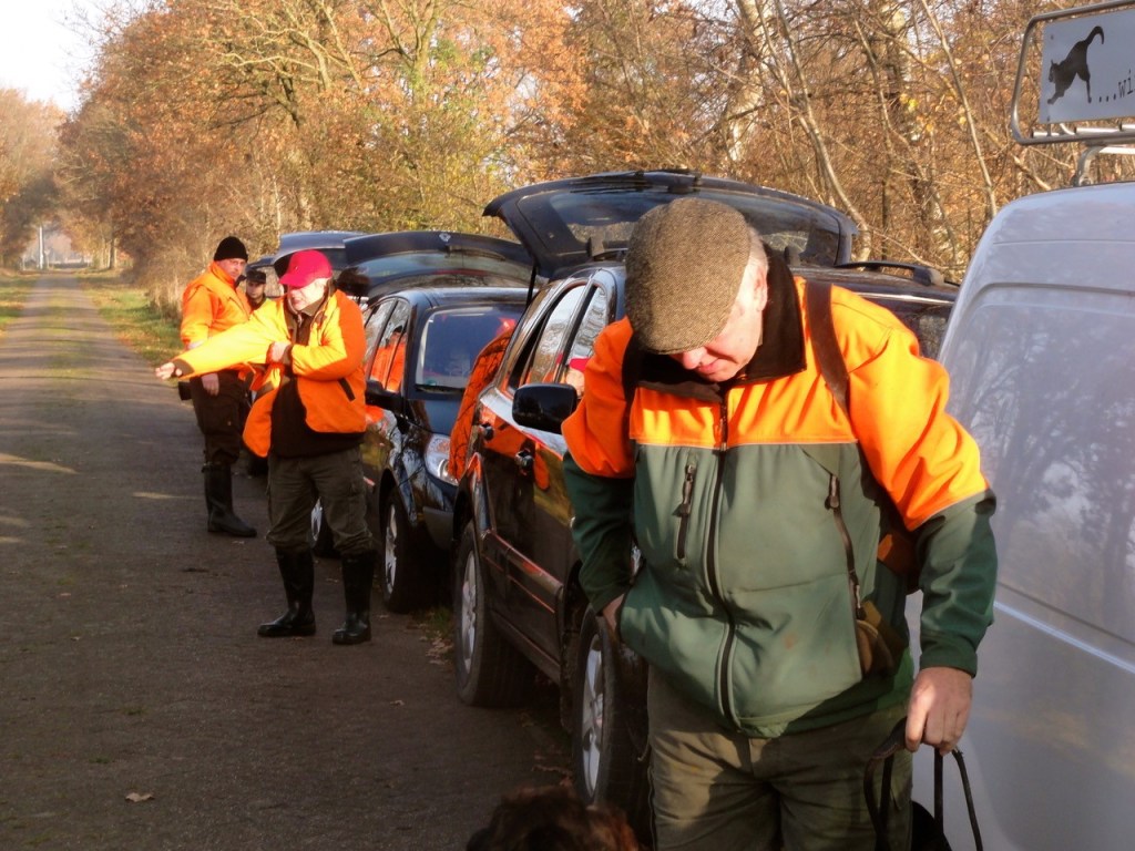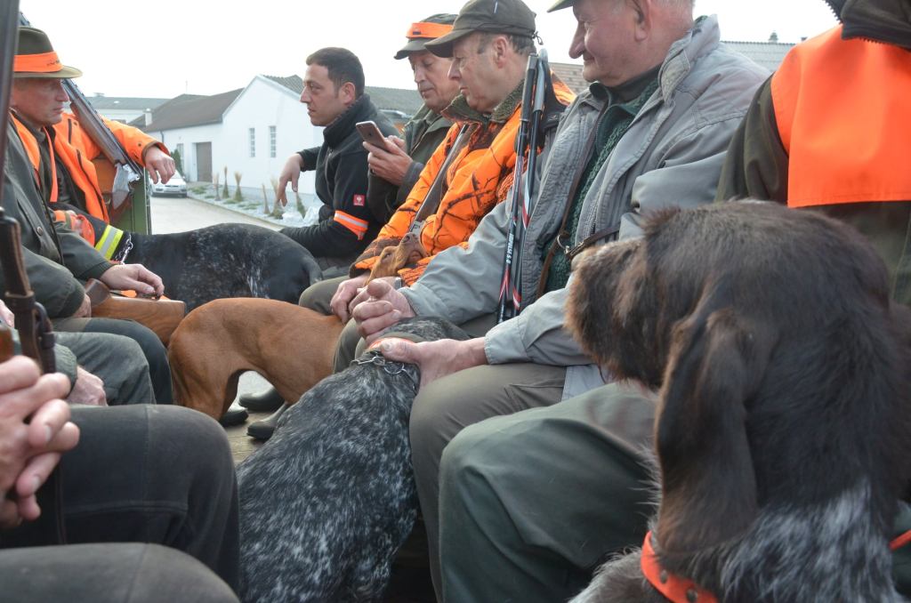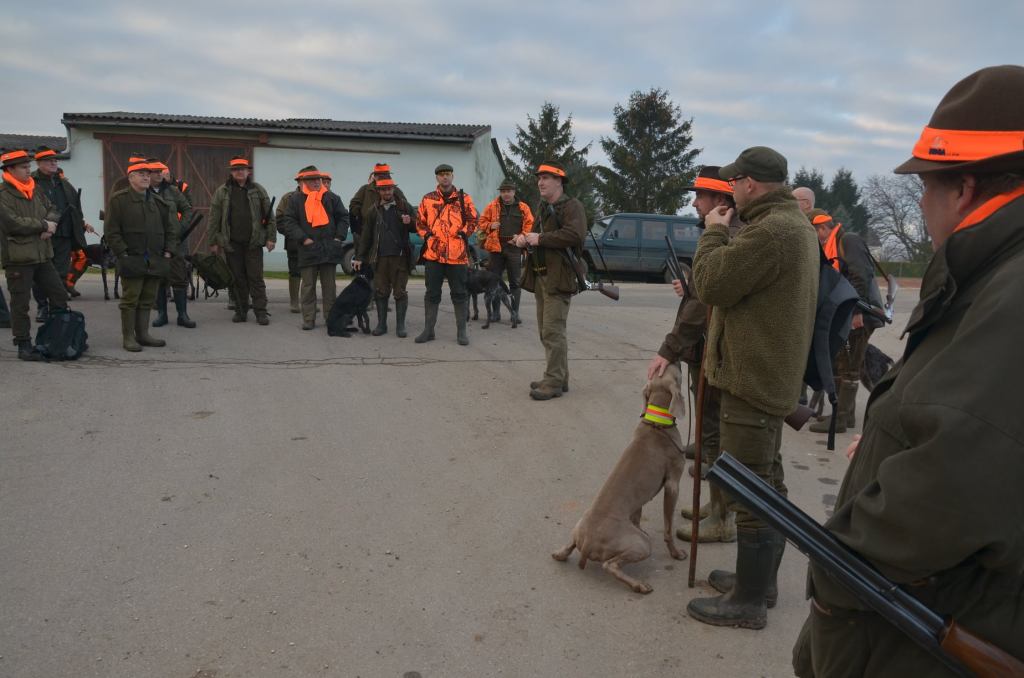 Stimmengemurmel, leises Gelächter und laute Hallo’s, Schulterklopfen, Händeschütteln, lebhafte Gespräche, Hunde, die sich an der Leine gehalten einander beschnuppern. Zeit vergeht. Sind alle da? Nun ein wenig Hektik. Einer der Jagdpächter ruft: „Fertigmachen bitte!“ Es wird Zeit für das erste Treiben. Geräusche von Autotüren und Kofferraumklappen, Signalkleidung anlegen, Flinte über die Schulter.