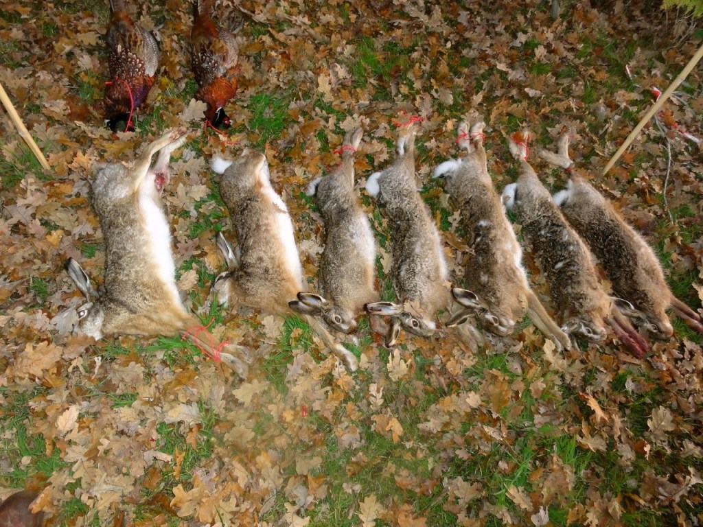 Es ist, auch wenn viele Hasen entkommen, genug da für eine gute Jagd und eine gute Strecke in diesem Revier: 40 Hasen und 5 Hähne für zwanzig Flinten an diesem Tag.