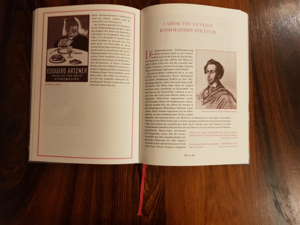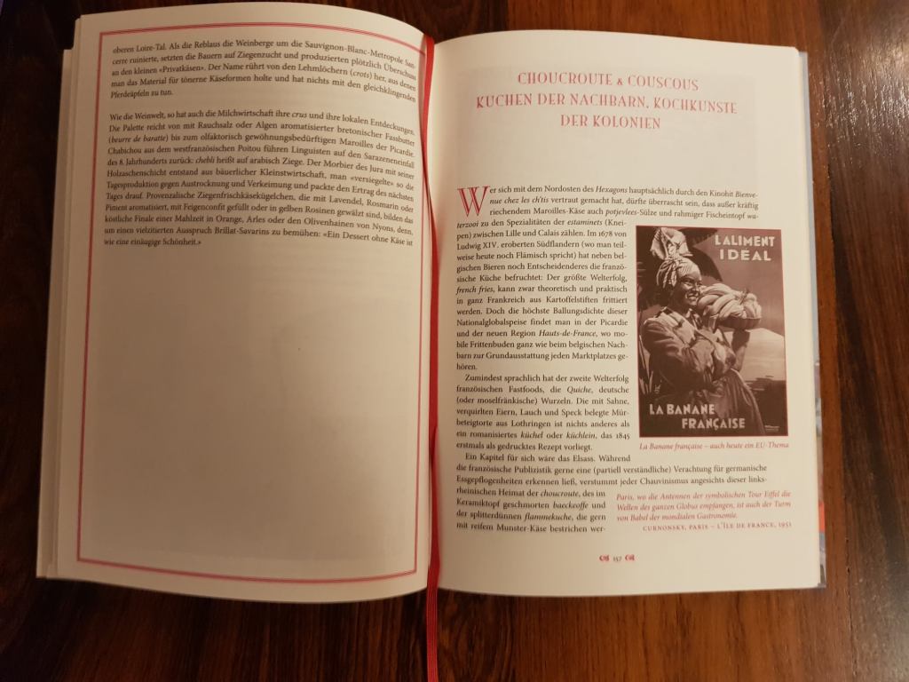 Nach einem einleitenden Kapitel (8 Seiten) folgt in einem ersten Kapitel eine Betrachtung der französischen Küche in der Antike, die sich der Diät der Gallier und der (eingewanderten) Römer zuwendet und mit einem Rezept für Essigbraten abschließt; hierauf folgt unter dem Stichwort Charcuterie ein Abschnitt zur französischen Schlachterkunst. Von der Antike erfolgt ein kleiner Sprung über die auch geschichtswissenschaftlich nur wenig durchdrungene dunkle Zwischenzeit von mehreren hundert Jahren in das Frankenreich kurz vor der ersten Jahrtausendwende und den hier bestimmenden Wechsel zwischen Fest- und Fastenküche und die dominierende Verwendung von Gewürzen; es folgen Rezepte unter anderem für Gewürzaustern und eine pikante Kaninchensauce, bevor sich ein Themenkapitel mit Bier und Cidre befasst. Direkt hieran schließt sich die Betrachtung der Renaissanceküche in Frankreich ein, die von Rezepten für Artischockenpasteten und Königinnensuppe abgerundet wird; das anschließende Themenkapitel ist Gemüse und Früchten gewidmet, zumal hier wohl der erste zarte Ansatz für eine französische Frischeküche gelegt wurde. Dies legt den Weg zur barocken Küchenepoche Frankreichs offen, die bis heute gewissermaßen stilbildend für die neuzeitliche Cuisine Française geworden ist und in der vor allem namentlich einzelne Individuen der Kochszene wie de la Varenne in den Blickpunkt des hungrigen Auges rückten. Beispielhaft werden hier Rezepte wie Ragout vom Kalbsbries oder – für schnitzbegeisterte Köche – Spargel in Erbsenform angeführt werden; thematisch wird das Kapitel von einem Anhang zu Meeresfischen und -früchten begleitet. Politisch folgte auf den Absolutismus die Revolution, deren kulinarische Auswirkungen im verstärkt aufkommenden Restaurantwesen sichtbar wurden und mit Rezepten zu frittierten Kartoffeln und dem napoleonischen Huhn Marengo illustriert werden; thematisch folgt an dieser Stelle ein Abschnitt zu Café und Chocolat. Das 19. Jahrhundert fokussiert sich auf die aufkommende Gastrosophie in Person von Grimod de la Reynière als „Pionier der Restaurantkritik“ und Jean Anthelme Brillat-Savarin als Vertreter kulinarischer Ratgeberliteratur, wobei den Abschluss des Kapitels das Thunfischomelette von Brillat-Severin und die Auberginen auf Pariser Art von Alexandre Dumas bilden; der thematische Fokus des folgenden Abschnitts bildet die Stopfleber. Das folgende Kapitel nimmt in zeitlicher Nachbarschaft Marie-Antoine Carême und den bis heute legendären Auguste Escoffier als Kodifikatoren neuzeitlicher französischer Küche in den Blick, was mit einschlägigen Rezepten wie der französischen Zitronatzitronencreme von Carême und dem Frosch im Kardinalsrock von Escoffier veranschaulicht wird; es folgt konsequenterweise ein thematischer Blick auf die Pâtisserie. Im weiterer zeitlich dichter Folge beschäftigt sich das nächste Kapitel mit Bistros und Boulevardiers im Pariser Leben und ihre Wechselwirkungen mit anderen Feldern der Philosophie und Kultur, was beispielhaft von Rezepten wie Wildtauben mit Oliven von Henri de Toulouse-Lautrec und einer gelierten Consommè mit süßsauren Kirschen aus dem Maxim’s begleitet wird; thematisch wird dem ein Abschnitt zum Champagner zugeordnet. Das folgende Kapitel befasst sich mit der Restaurantkritik seit Beginn des 20. Jahrhunderts in Person von Maurice Edmond Saillard, besser bekannt als Churnonsky, und seinem Guide Michelin, sowie Henri Gault und Christian Millau und ihrem Gault-Millau, sowie der hiermit verbundenen Nouvelle Cuisine Française, was wiederum von beispielhaften Rezepten für ein Bohnencassoulet und für Erbsen auf französische Art von Paul Bocuse beschlossen wird; der dazugehörige thematische Abschnitt ist dem Käse gewidmet. Endgültig im 20. Jahrhundert angekommen wird nun der Blick auf Einflüsse seitens der Nachbarn und der französischen Kolonien gerichtet, wofür dann Rezepte für ein algerisches Rind mit getrockneten Aprikosen und für kreolische Garnelenpuffer angeführt werden; in thematischer Hinsicht werden nun Spirituosen behandelt. Das folgende Kapitel erweitert den Blick auf die Beziehungen der französischen Küche zur gesamten Welt, was von Rezepten für ein Veilchensoufflé und für Sellerie mit heißer Anchovisauce begleitet wird; thematisch werden hier konsequenterweise die Pommes Frites in den Blick genommen. Abgeschlossen wird das Buch von einem Kapitel zur französischen Küche in der Gegenwart mit Rezepten für gratinierte Speisedisteln von Alain Ducasse, für eine Terrine von der Bouillabaisse von Gérald Passeda und für Brie de Meaux von Anne-Sophie Pic; dem folgt noch ein thematischer Abschnitt zum französischen Wein.