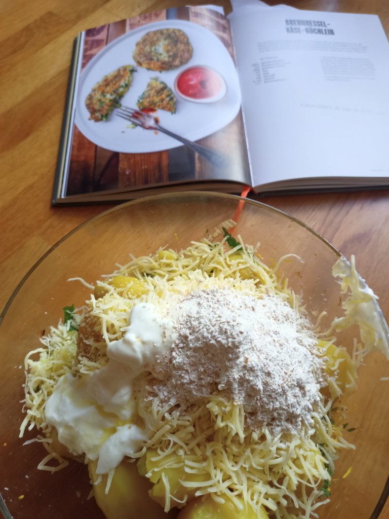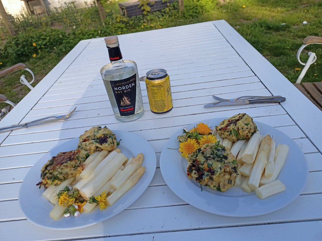 Die Kombination aus frischen Frühlingskräutern, Kartoffeln und Käse ist einfach lecker. Ich bin bekennender Sissi und nehme lieber Kräuter, die nicht brennen. Im Moment stehen Taubnessel, Löwenzahn, Gundermann und Knoblauchrauke in der Blüte und in meinem Garten. Ich dachte immer, es wäre ungepflegt, NEIN, es ist ein Wildkräutergarten. Das Rezept ist einfach, die Kombination ist gut. Für einen kochtechnischen Erkenntnisgewinn fehlt mir ein bisschen mehr Info im Rezept als: „Alle Zutaten zusammenmischen, Küchlein formen und braten“. Das Rezept für den selbstgemachten Ketchup, der dazu empfohlen wird, spart man sich. Ich habe die Küchlein mit Ofenspargel serviert. Die Küchlein waren geschmacklich lecker, mit der Konsistenz war ich nicht zufrieden – wie gesagt, ein Hinweis im Rezept auf die Zubereitungsmethode für die Küchlein fehlt.