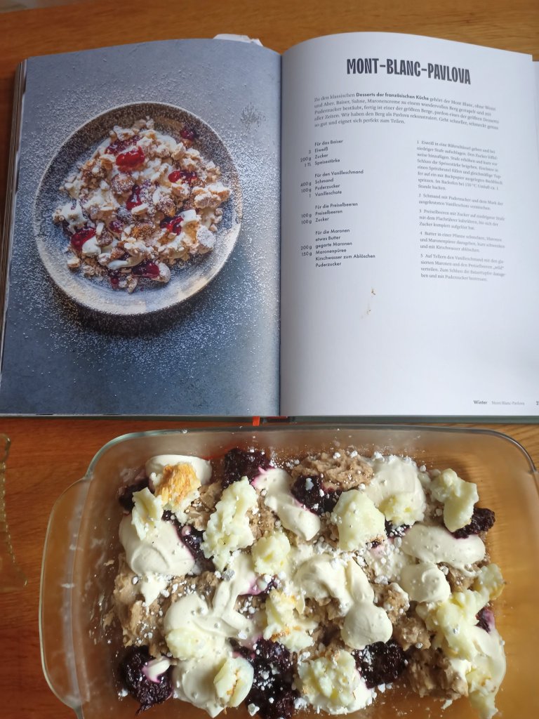 Ein neues Rezept ist Mont-Blanc. Auch nach Jahren im Schweizer Einflussbereich ist mir das nicht serviert worden – Sünde. Leider ist einer der Nachteile daran in Nordfriesland zu leben, die schwierige Versorgung mit hochwertigen Lebensmitteln. Erfolglos Ich habe drei Supermärkte nach Maronencreme abgeklappert. In zwei davon wusste das Personal nicht mal, was ich wollte. Schnüff. In einem Bio-Supermarkt habe ich dann für sündhaftes Geld eine Miniportion gekochter Maronen erstanden. Naja, die Zeiten sind hart. Ich bin an den Baiser-Tupfern gescheitert – ich gebe es zu, man kann nicht alles können. Erst wollte das Eiweiß nicht steif werden und dann sind sie Dinger oben braun geworden, bevor sie unten hart waren.