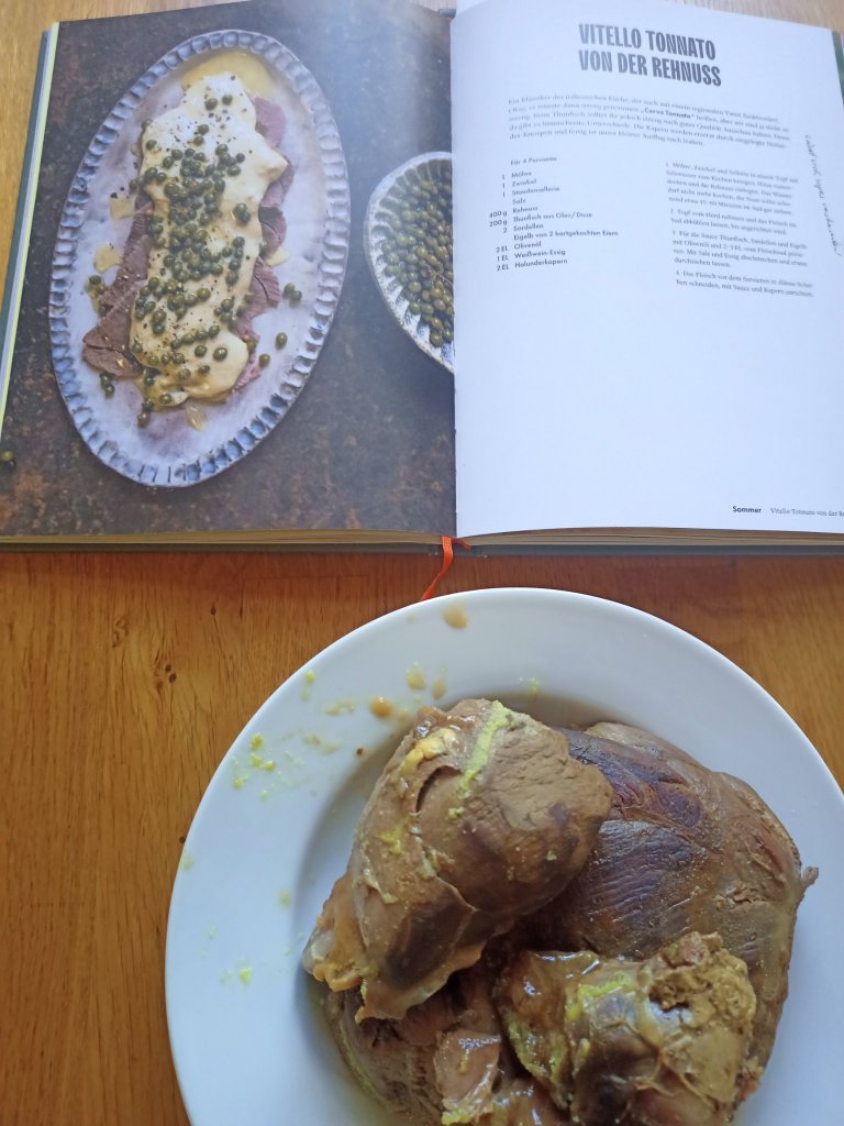 Ein Rezept, dass irgendwie gerade in keinem der Neuerscheinungen zu Wildrezepten fehlen darf. Sei es drum, ich mag das ganz gern. Ich habe das Fleisch bisher immer Sous-Vide gegart und habe mich in diesem Fall an das Rezept gehalten und in Gemüsesud gar gezogen. Das hat den Vorteil, dass der Sud als Basis für die Thunfisch-Sosse dienen kann. Im begleitenden Buchbild ist mir das Fleisch zu grob geschnitten, obwohl das Rezept „dünne Scheiben“ vorsieht. Das ist wieder handwerklich ein wenig grob – Mälzer lässt grüßen. Geprägt von Schweizer Lebenskultur, vertrete ich die Auffassung, dass Fleisch kann nicht dünn genug geschnitten sein.