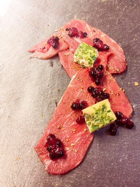 Carpaccio von der Rehkeule mit Holler-Röster und Kräuter-Eierstich