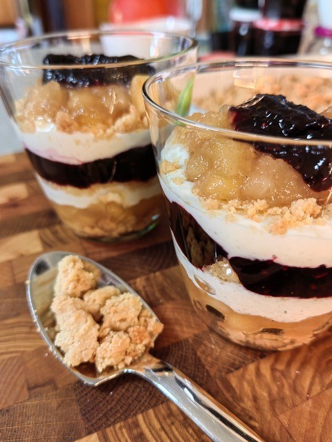 Für einen schnellen Nachtisch kochte ich ein Kompott aus Holunderbeeren, Apfel, Birne und Zimtblüte. Gesüßt und gebunden wurde es von mir mit Gelierzucker. Heiß abgefüllt wartet es jetzt auf Verwendung. Getestet wurde es als Schichtdessert mit Apfelkompott, Joghurt und Zimtstreuseln. Bei Gelegenheit werde ich es auch in einem Eis mit gesüßter Kondensmilch verwenden.