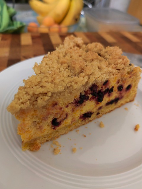 Beim Kürbis-Käsekuchen mit Streuseln fügte ich Holunderbeeren der Käsemasse hinzu. Ein leicht säuerlicher Kontrast zur süßen Kürbismasse.