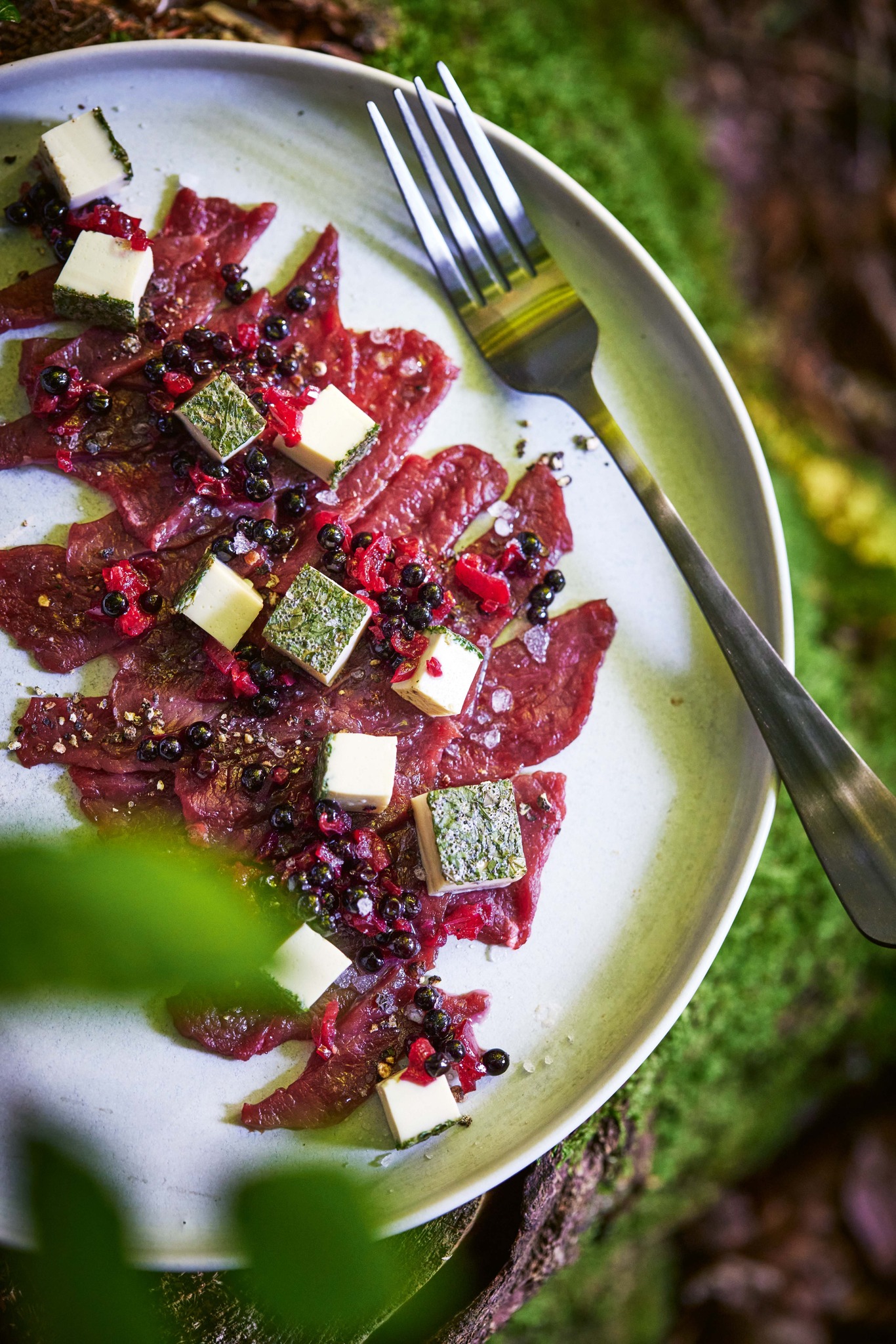 Carpaccio von der Rehkeule mit Holler-Röster und Kräuter-Eierstich