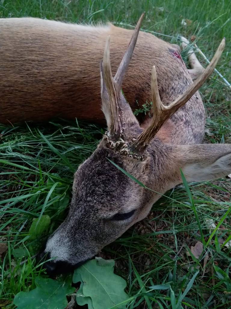 Mein knappes Kilo für die Rehburger stammt von einem meiner zwei erlegten Böcke aus diesem Jahr. Im Mai wollte es wieder mal nicht klappen, dafür aber an einem schönen Abend Anfang Juni. Ich saß an der Getreidekante an und hoffte, dass sich der bestätigte schwache Jährling endlich zeigt. Zwei Stunden vergingen, in denen hinter mir im Wald nur einmal ein Schrecken zu vernehmen war. Plötzlich kam von halb links auf ca. 300 m ein Stück Rehwild „lautschimpfend“ über die Straße und wechselte 200 m links von mir in den Wald. Durchs Fernglas sprach ich einen älteren Gabler an.