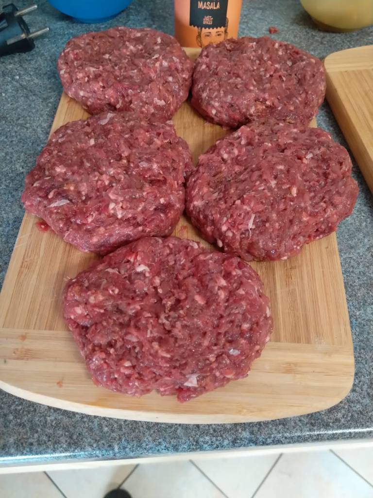 Das Wildbret war schnell durch den Wolf gedreht und mit Garam Masala, Pfeffer und Salz gewürzt. Wenn ich sonst Wildbuletten mache, kommt immer Ei und Semmelbrösel dran. Das stand aber nicht im Rezept, also diesmal ohne.