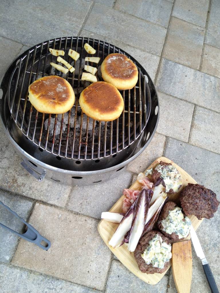 Die selbstgebackenen Burgerbrötchen (Rezept siehe unten, wirklich!) wurden aufgeschnitten, mit Butter bestrichen und, genau wie der Radicchio, die Birnenspalten und der Bacon kurz auf dem Grill angeröstet. Das hat mir sehr gut gefallen!