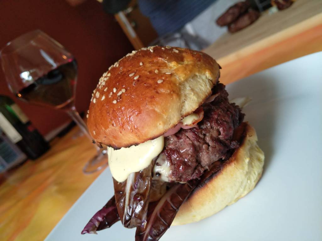 Dann kommt sie zu mir aufs Sofa und wirft einen Blick auf das Rezept. Die schwarzen Brötchen gefallen ihr genauso wenig wie mir. Alles andere klingt „ganz gut“. Schnell hat sie auf Pinta ein Rezept für Burger-Brötchen gefunden. Wir backen schon lange unser Brot und Brötchen selber. Einkaufen brauchen wir nur Radicchio, Bacon und Blauschimmelkäse. Mayo habe ich schon öfter selber gemacht. Damit es Trüffelmayonnaise wird, habe ich Distel- mit etwas Trüffelöl gepimpt. Das war wirklich lecker.